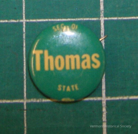 Made for the campaign of Republican Richard Thomas (1937-1991) for Vermont Secretary of State. He served four terms from 1968-1977, and then lost to Democrat James Guest when he ran for re-election in 1976. He also ran unsuccessfully for Congress in 1971, losing in a Republican primary.
