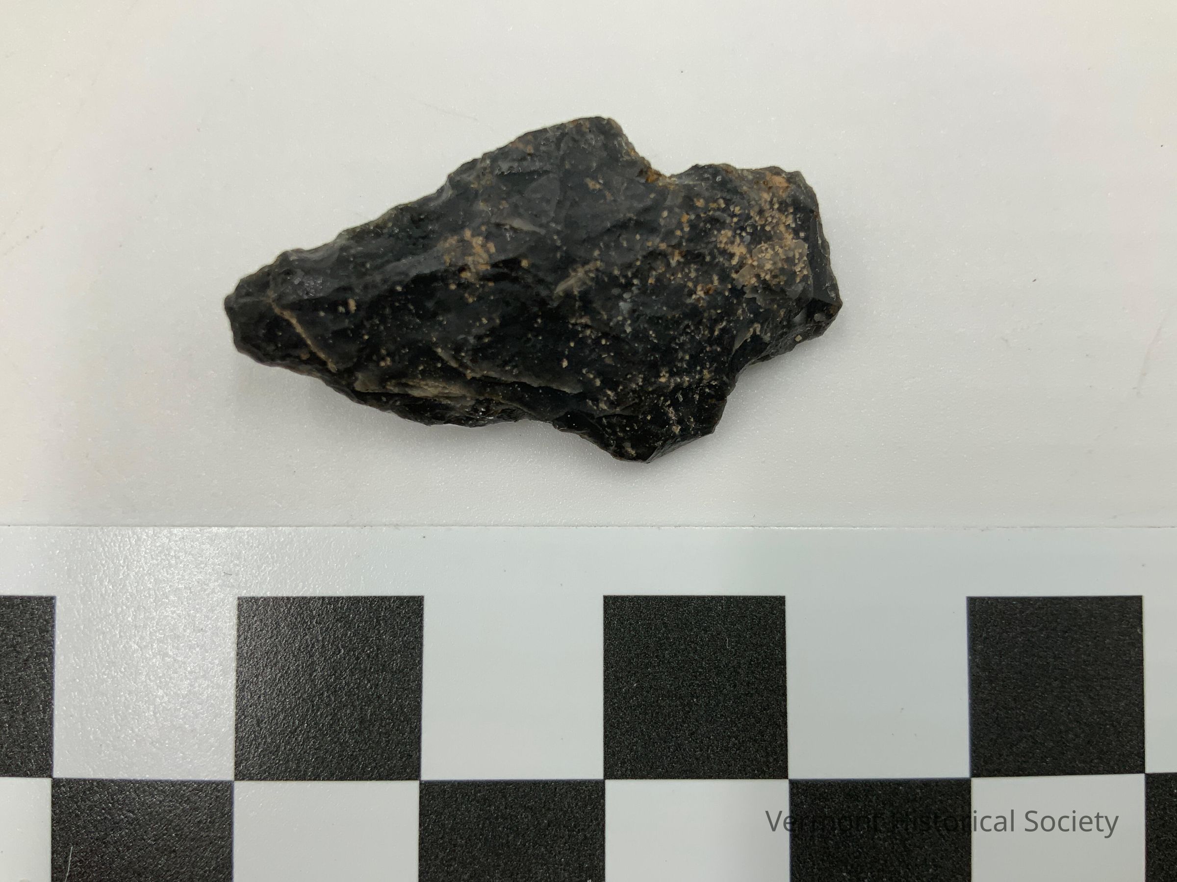 Small black chipped stone projectile point with a straight stem. It has a straight base and blade edges and is asymmetrical.