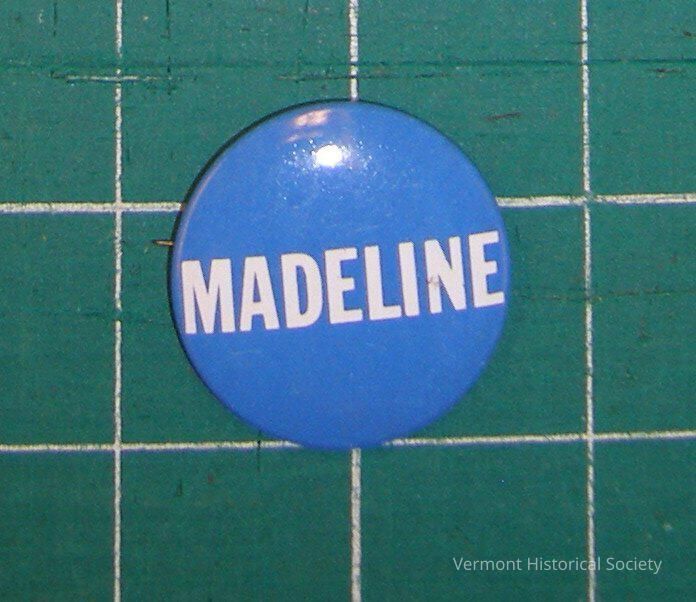Though it is unclear which Madeline this button was made for, it could be Madeline Harwood of Madeline Manahan. Madeline Harwood went for the U.S. House in 1974 but lost in the Republican primary. She ran for state representative from Bennnington-Rutland 2 and won in 1988, but lost her bid for re-election in 1990. Madeline Manahan was a Democrat elected as state representative from the Franklin-2 district in 1994 and 1996.Acquisition