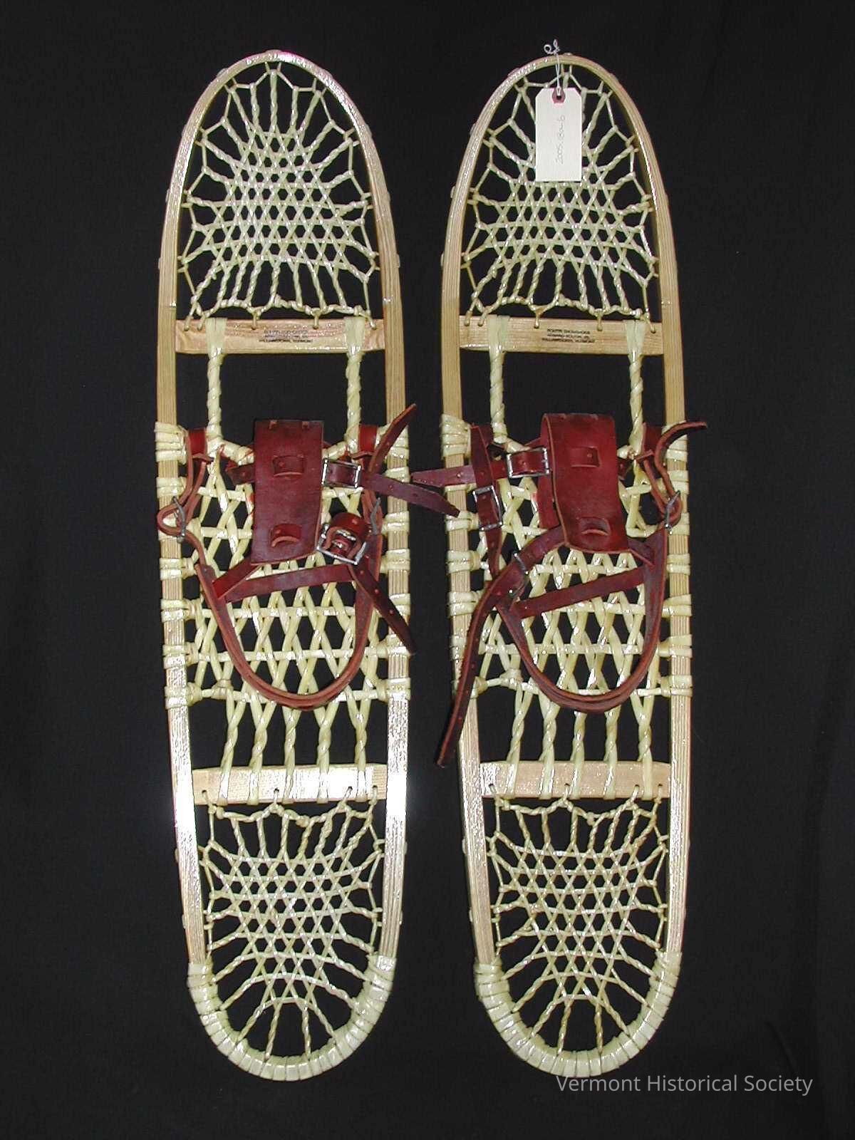 Pair of bentwood and rawhide snowshoes. There are two crossbeams, one near the toe and one near the heel. Rawhide is woven between the outer frame and crossbeams in a 6-pointed stair pattern, with a square hole left at the center beneath the crossbeam at the toe. There are leather straps for holding onto the wearer's foot attached to the edge of the square hole. The cross brace of each shoe is stamped with the label, "BOUTIN SNOWSHOES ARMAND BOUTIN, JR. WILLIAMSTOWN, VERMONT."Context
