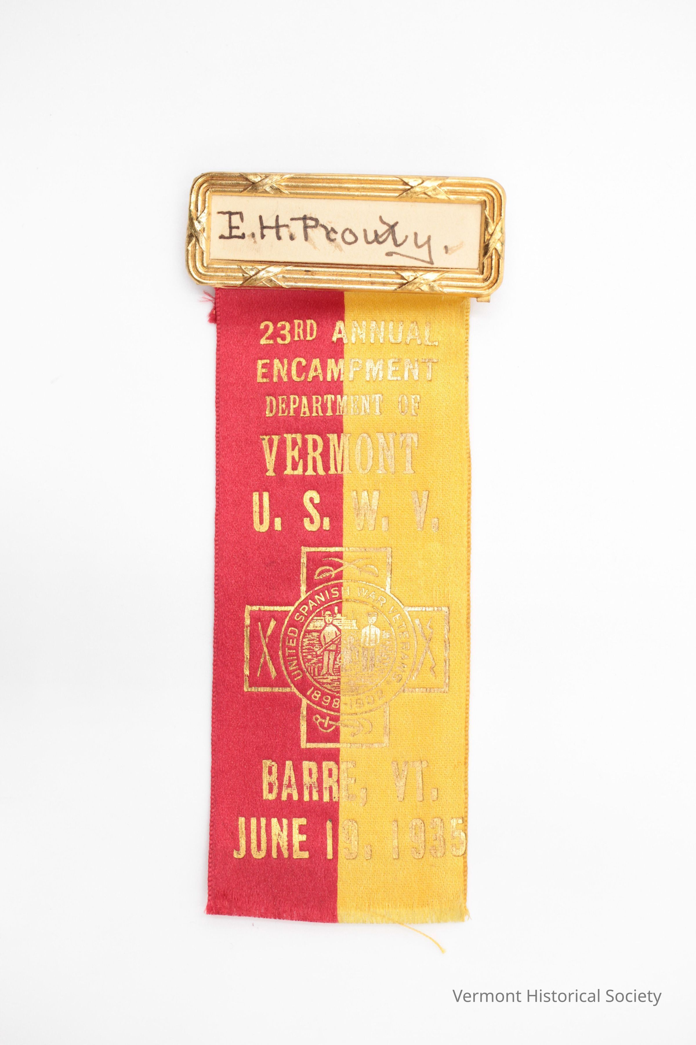 Red and yellow satin-woven silk ribbon printed in gold with the inscription, "23RD ANNUAL ENCAMPMENT DEPARTEMENT OF VERMONT U. S. W. V. BARRE, VT. JUNE 13, 1935". There is a logo in the center consisting of a cross with weapons on the arms and an illustration of two men in the center. The logo says, "UNITED SPANISH WAR VETERANS 1898-1902". The top of the ribbon is connected to a rectangular gold frame pin, into which is inserted a piece of paper with the hand-inked name, "E. H. Prouty".Context