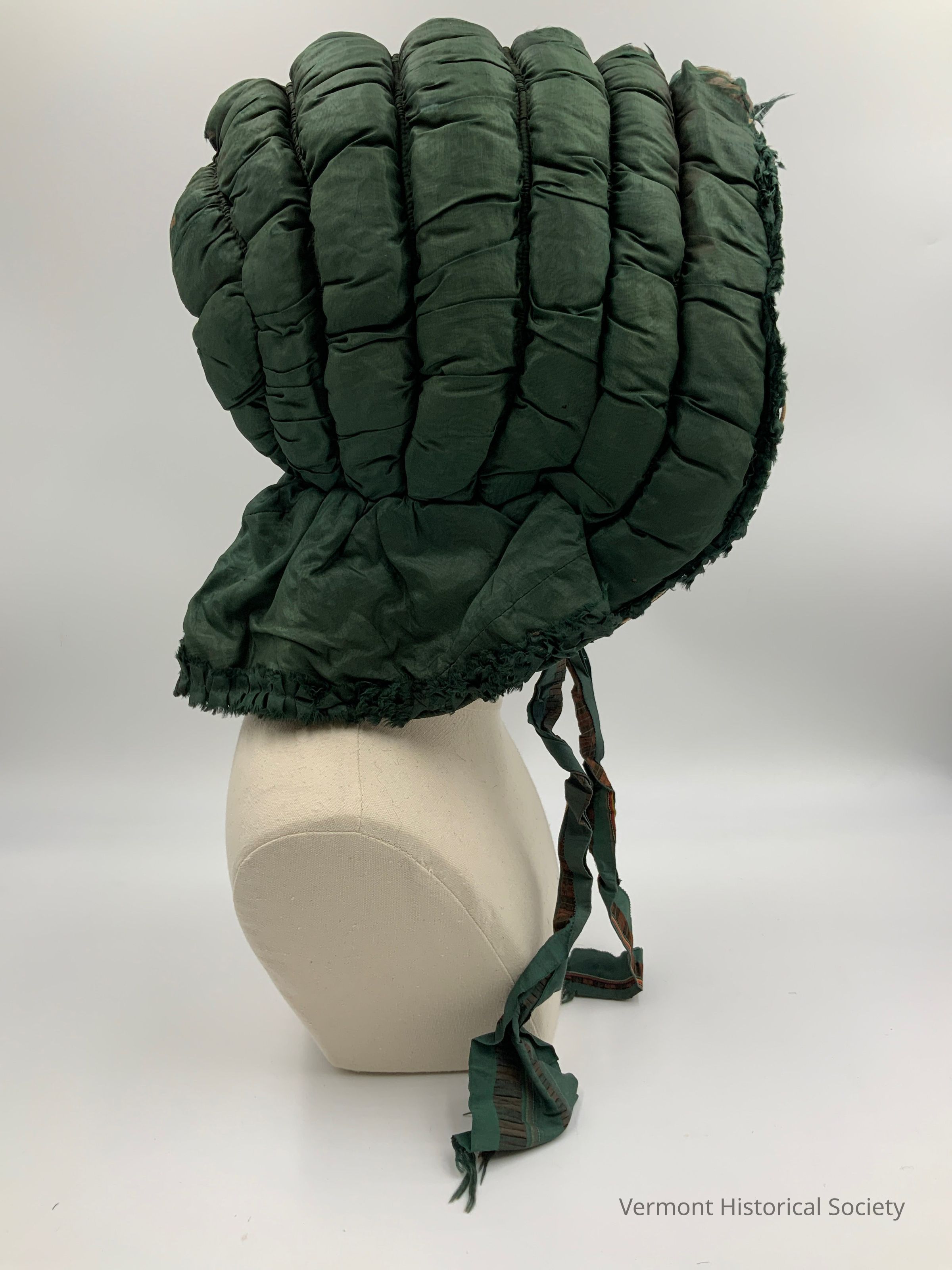 This thickly quilted winter hood or bonnet has an exterior and lining fabric of green silk taffeta. It is quilted in thick channels with a narrow row of piping along each quilting line. The tail reaches the wearer's shoulders and joins with the brim. The bonnet is tied under the chin with green ribbons. The edge of the brim is shaped by an interior metal wire. There is a hole at the top, revealing that the batting is a mixture of undyed and purple wool.