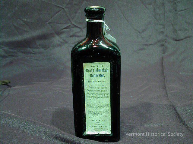 Rectangular brown glass bottle with a paper label reading, "SMITH'S Green Mountain Renovator." The label also contains directions for use. The other side of the bottle is molded with the inscription, "SMITH'S GREEN MOUNTAIN RENOVATOR.", and the sides are molded with the inscriptions "REMEDY COMPANY" and "ST. ALBANS, VT." The bottle is sealed with a cork and full of liquid.Context
