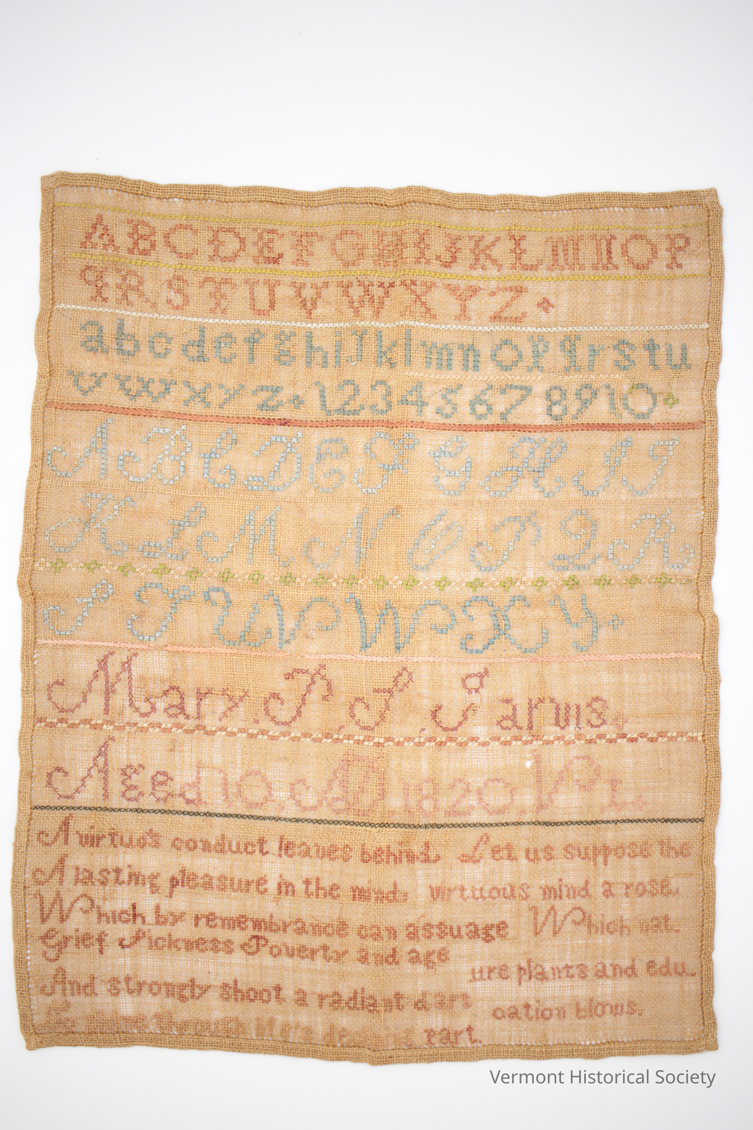 Linen sampler made by "Mary P.S. Jarvis- Aged 10- A.D. 1820 Vt."