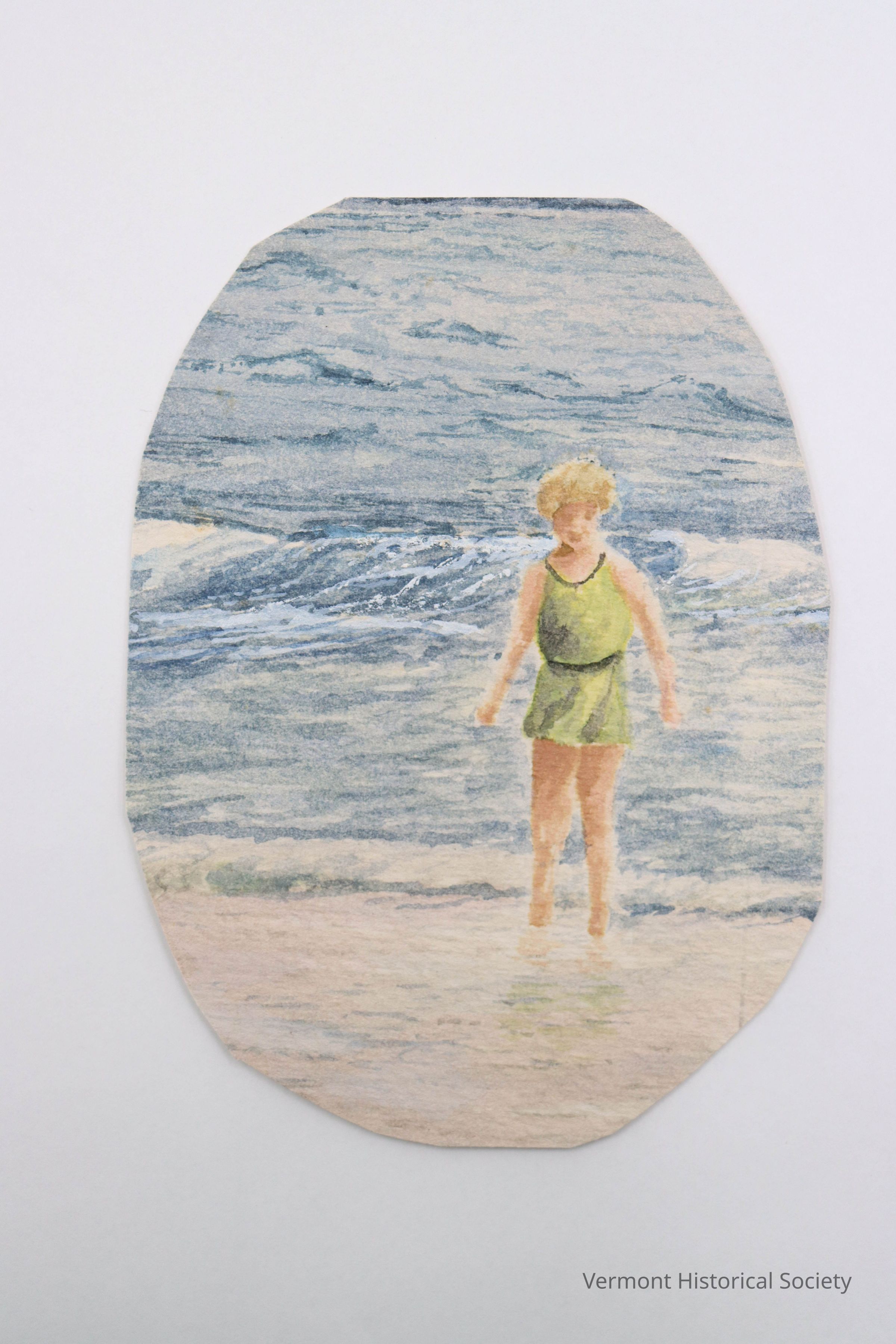 Small watercolor painting on paper depicting a child standing at the edge of the ocean or other body of water. The child is white, with blond hair, and is wearing a green swimsuit. There are small waves behind the child. The painting is cut into an oval.Type of Painting