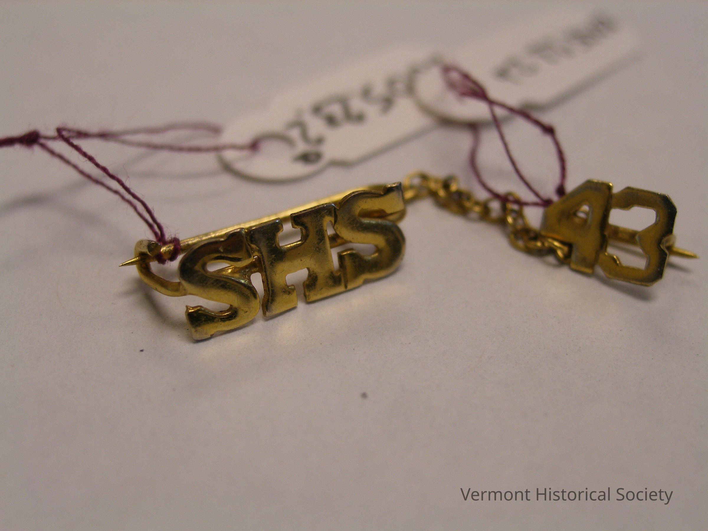 Two-piece pin consisting of the initials SHS and the number 43 connect by a short chain. The two parts are each backed with a hinged pin.