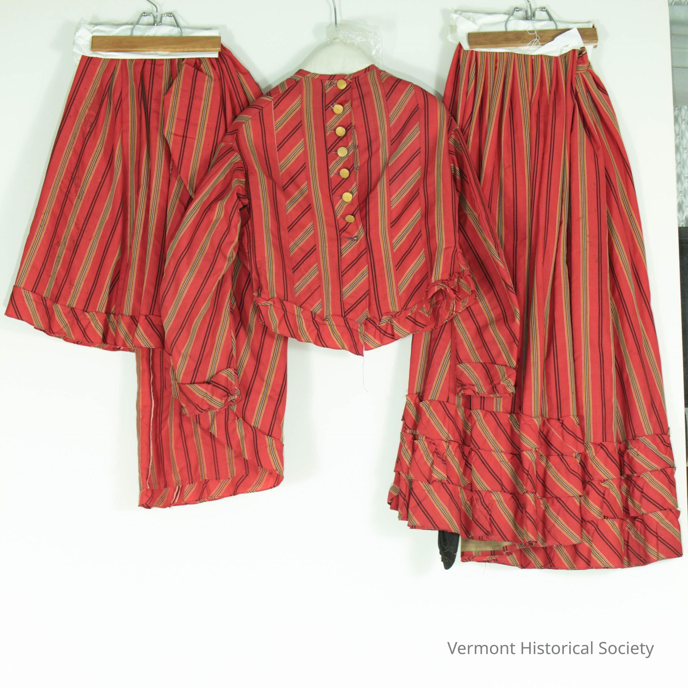 Dress consisting of a bodice, skirt, and and overskirt. Each piece is made of red wool woven with black and white stripes. The hems of all three pieces as wells as the cuffs of the sleeves are decorated with bias-cut strips of self fabric, set so the stripes are angled diagonally. The button placket and two vertical stripes on the bodice are cut on the bias as well. The bodice opens at the center front and secures with brass buttons.Context