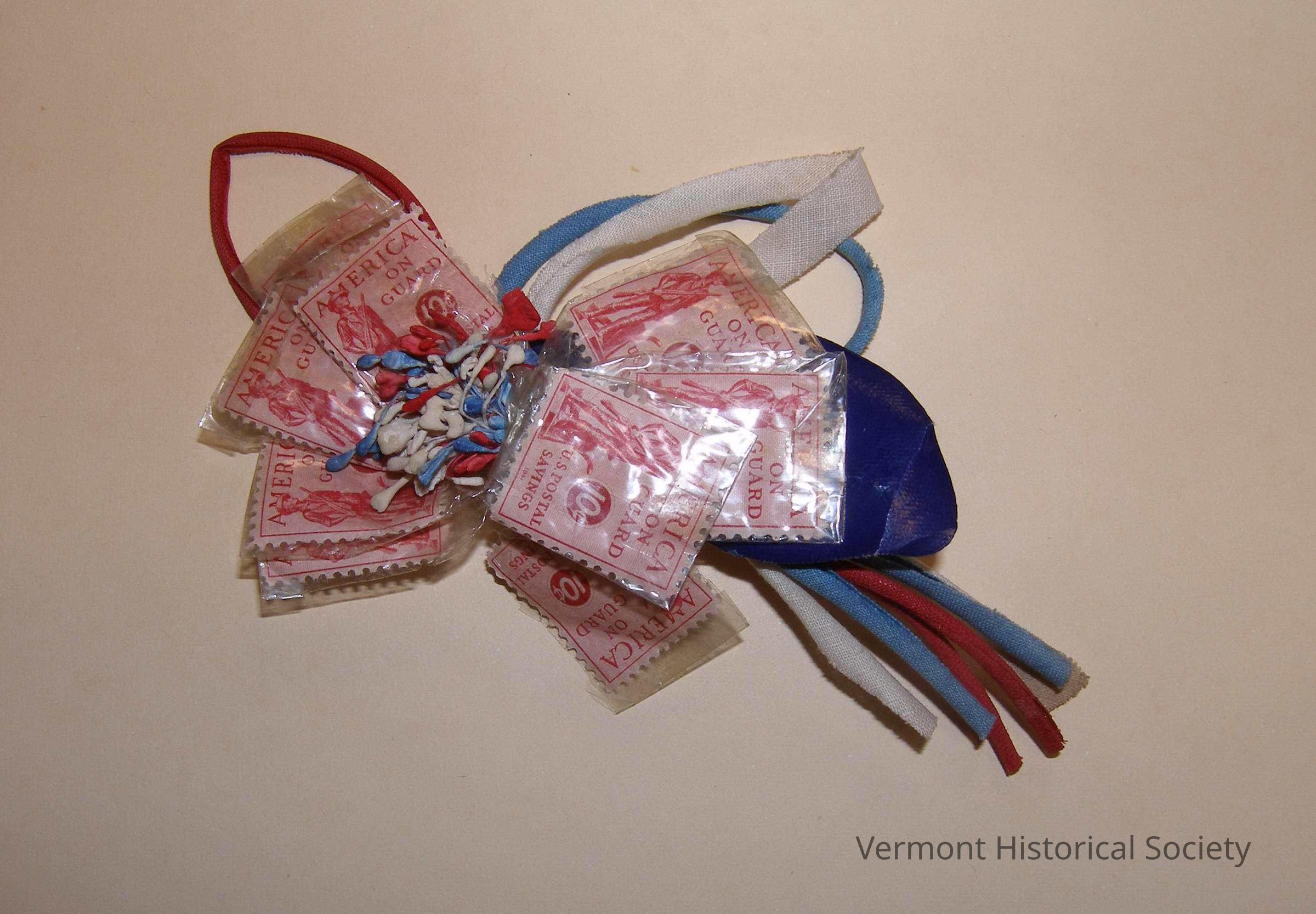 Corsage made from postage stamps and cotton fabric. Each stamp is encased in cellophane and printed with the words "AMERICAN ON GUARD / 10C / U.S. POSTAL SAVINGS" and an image of a soldier. They are tied to a red-white-and-blue bunch of fake floral buds and 3 bias-cut strips of cotton (red, white, and blue).Context