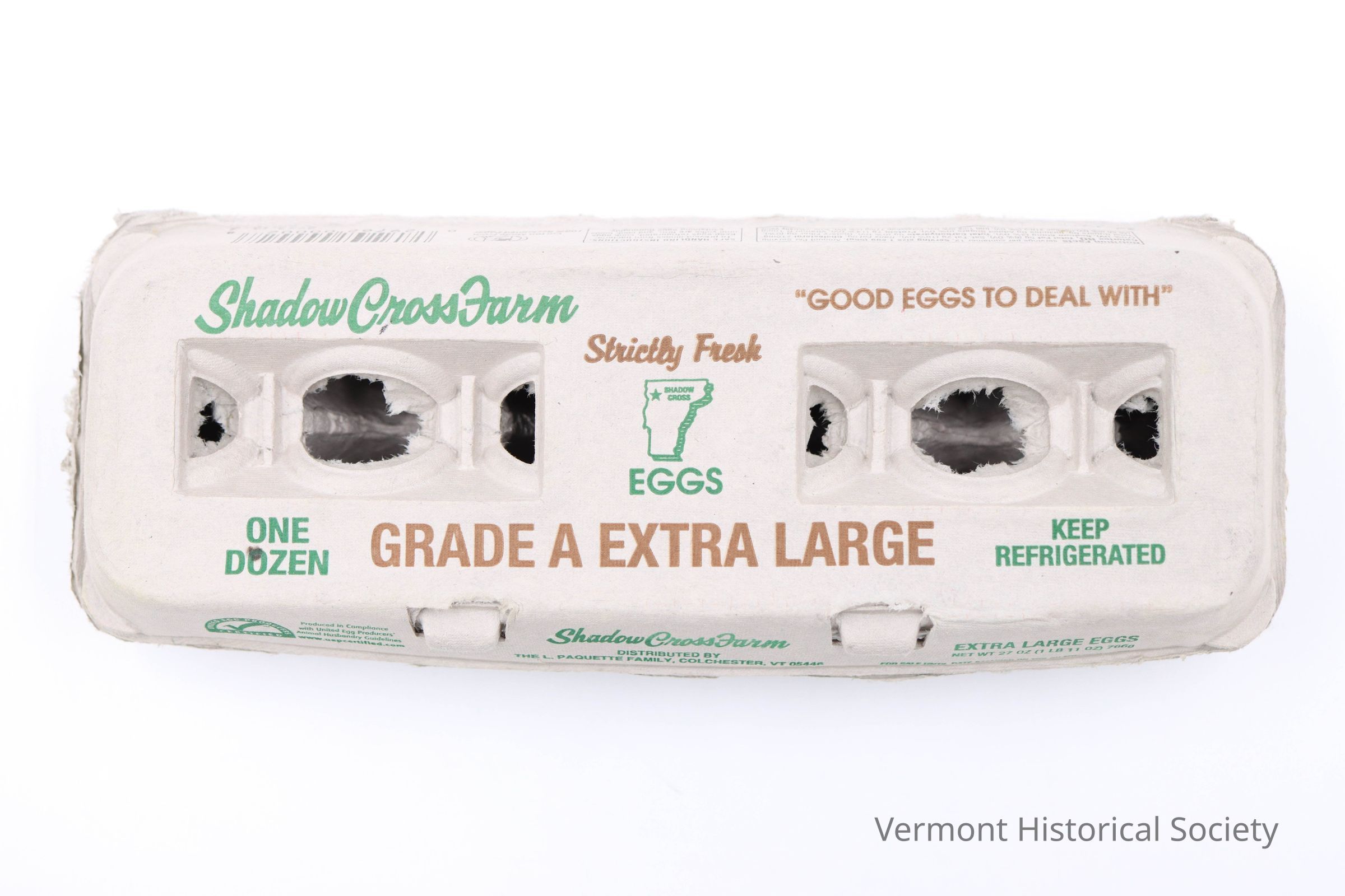 Grey cardboard egg carton printed in green and brown with branding and nutritional information. The bottom of the carton is molded with 12 egg-shaped divots, and the top of the carton has 6 oval holes along the center, allowing for a few of any eggs contained within. It opens via a narrow strip hinge across the back, and secures closed with 2 tabs protruding from the base at the front. The top is printed with the company name, "Shadow Cross Farm", the phrase, "GOOD EGGS TO DEAL WITH", and informational copy. The front is printed with contents, governmental certifications, and the company's contact information. The back is printed with a table of nutritional information and a bar code.Context