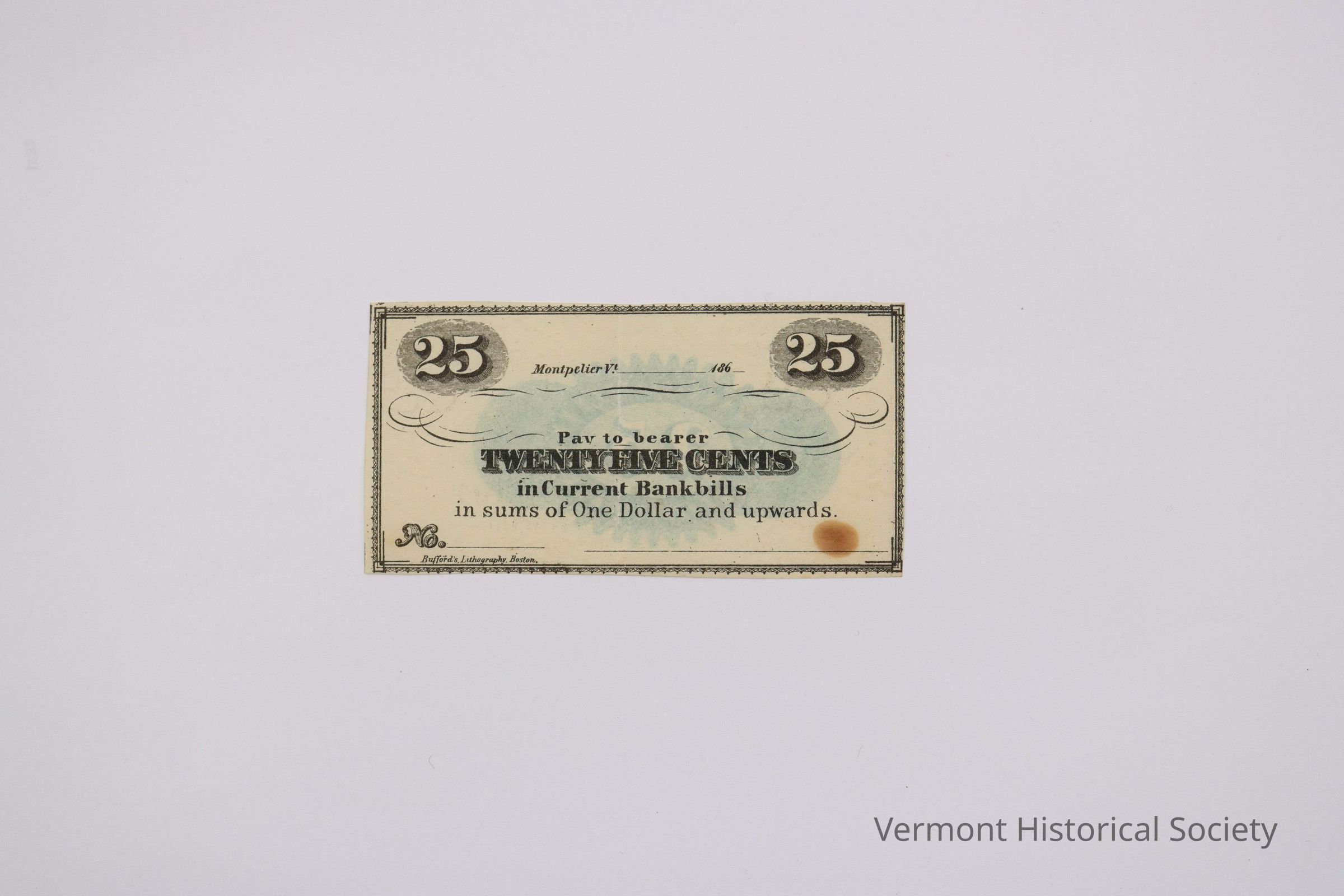 A fractional currency scrip with a value of 25 cents. In both corners are the numbers 25. Between it says, "Montpelier Vt " followed by a line on which to write the month, followed by the year, part of which is provided -- "186_" This side also says, "Pay to bearer twenty-five cents in Current Bankbills in sums of one dollar and upwards."