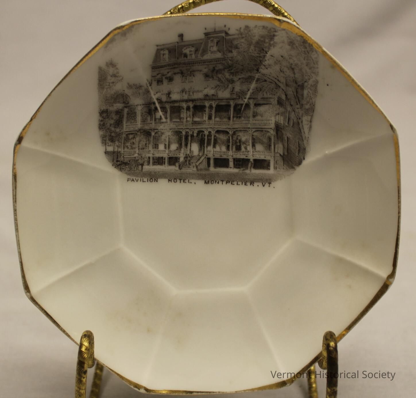 Octagonal demitasse saucer printed with an illustration of a large building with a porch and balcony across the front. The image is labeled, "PAVILION HOTEL, MONTPELIER. VT." The bottom of the saucer is marked, "MADE IN GERMANY FOR MARVIN & SHERBURNE MONTPELIER, Vt. 83."Context
