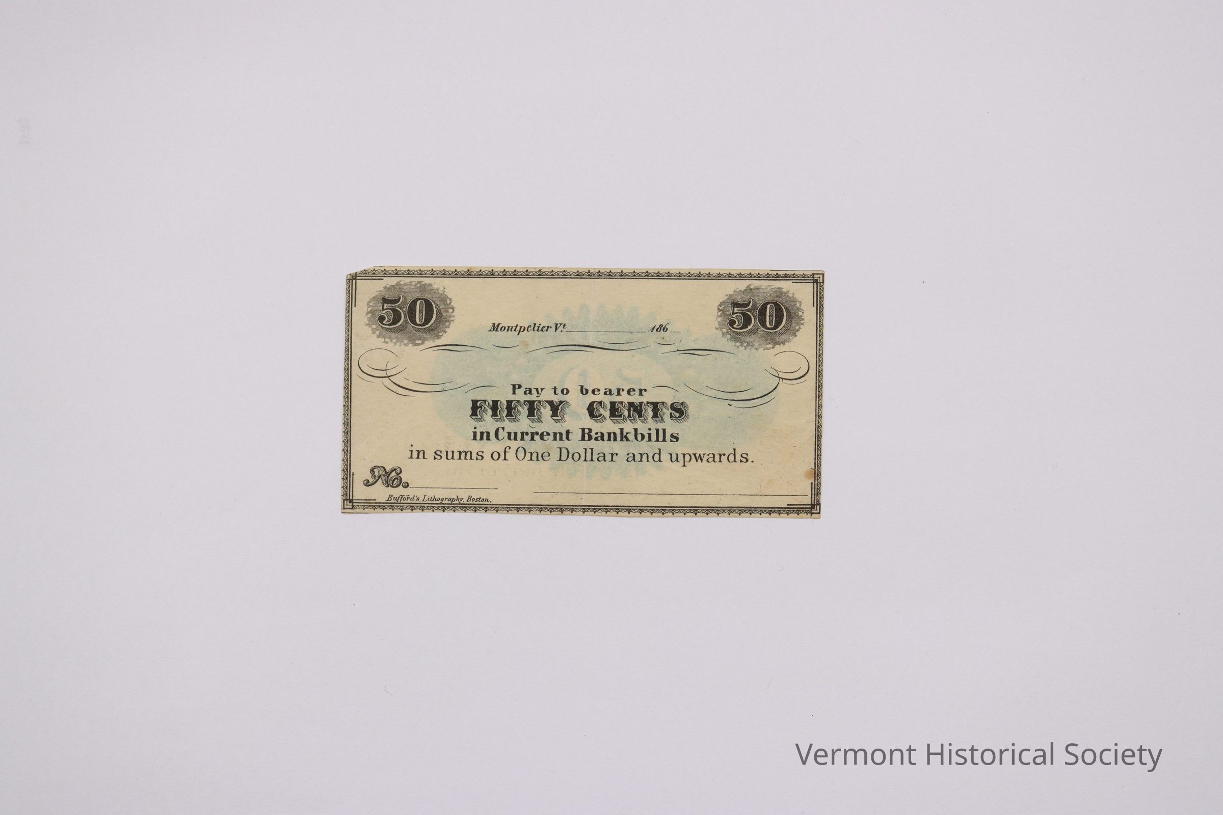 A fractional currency script with a value of 50 cents. In both corners are the numbers 50. Between it says, "Montpelier Vt " followed by a line on which to write the month, followed by the year, part of which is provided -- "186_" This side also says, "Pay to bearer fifty cents in Current Bankbills in sums of one dollar and upwards."