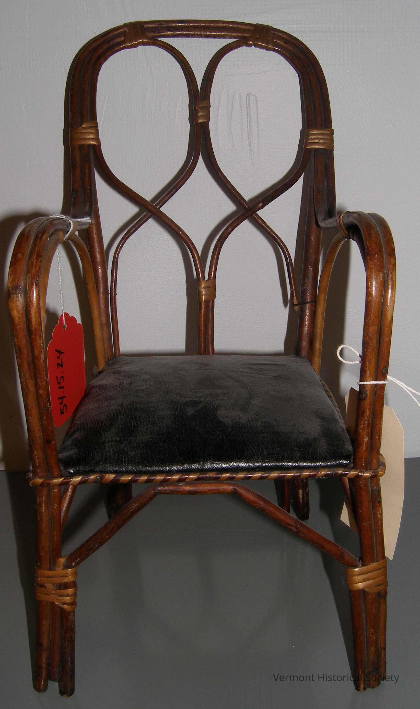 Bentwood armchair sized for a large doll. The chair seat is padded and covered with shiny black leather. The seat back has bentwood in figure-8 shapes.Context