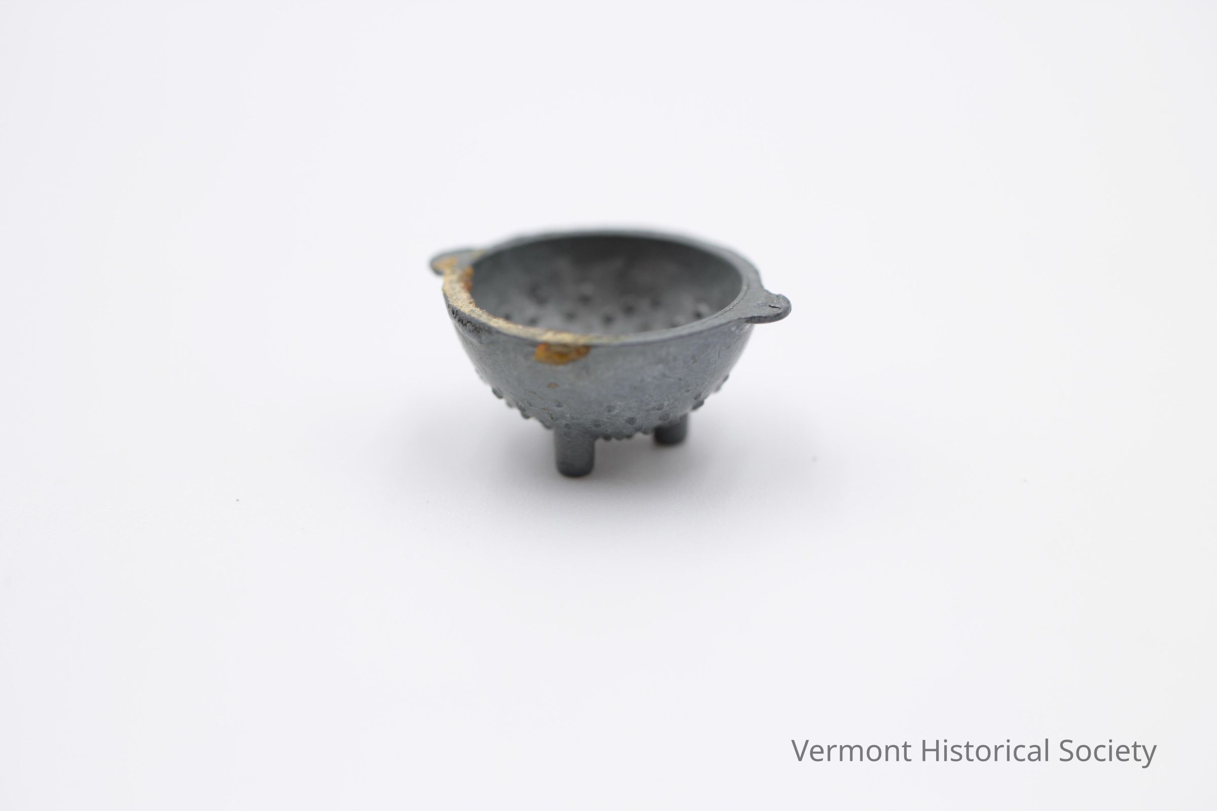 Miniature metal colander consisting of a round bowl on three feet. The colander's holes are represented by small bumps on both the interior and exterior of the bowl.Context