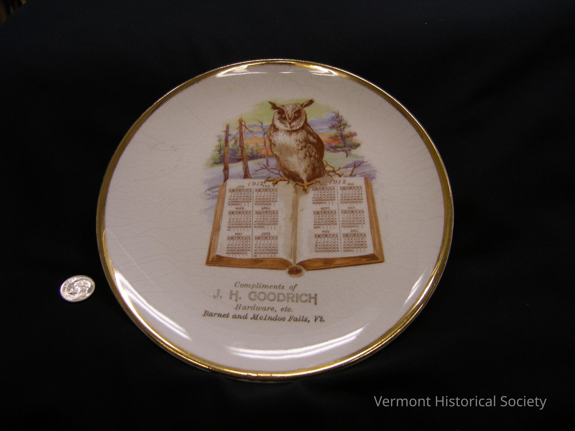 Advertising calendar plate for the year 1912. The plate shows an image of an owl perched on a large book in front of a winter scene. Within the book is a calendar of the year 1912, January through December, separated by month. The center bottom is labeled, "Compliments of J. H. GOODRICH Hardware, etc. Barnet and McIndoe Falls, Vt."