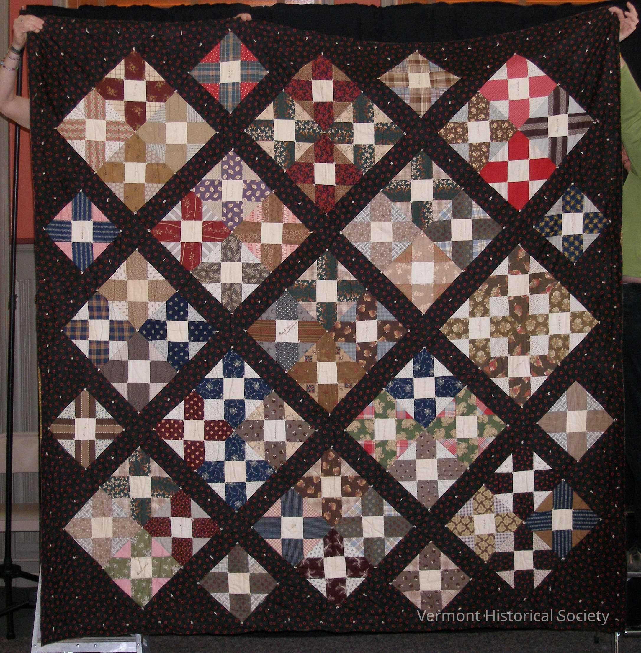 Family tree autograph quilt signed with names of members of the Sparrow family of Calais, Vermont. The quilt is pieced of squares with cross designs set diagonally. The blocks are largely grouped into sets of four, with single blocks filling in around the edges. Each block contains three fabrics: a dark/prominent print (forming the cross), a light/subtle print filling the triangles at the edges, and a plain white center square. The center square of each block has the name of a person, sometimes the person's life dates, and the person's relationship to either the maker or recipient of the quilt (i.e. grandmother).Context