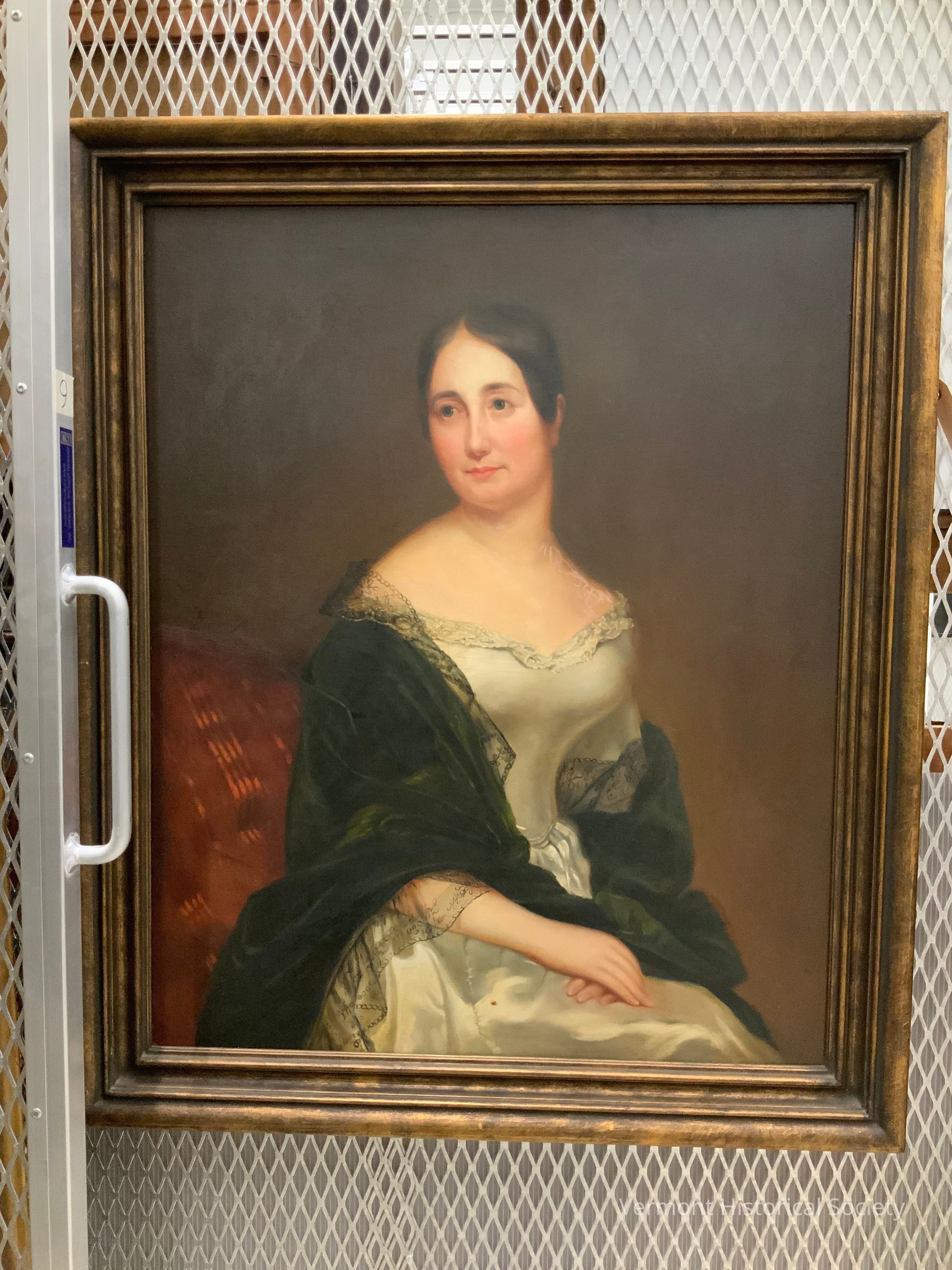 Three-quarter length portrait of Jane Maria Leavitt Hunt attributed to Spiridione Gambardella. Hunt sits in an ivory silk gown with a low lace-edged neckline, delicately loose sleeves, and simple silhouette. She has a black lace-edged shawl draped around her torso and her hands folded gently across her lap. Her hair is parted at the middle and gently draped to cover her ears before being gathered at the back of her head. Hunt sits on a red striped velvet sofa and gazes into the distance just in front of her right shoulder. The painting resides in a simple carved gilt gesso frame.Type of Painting