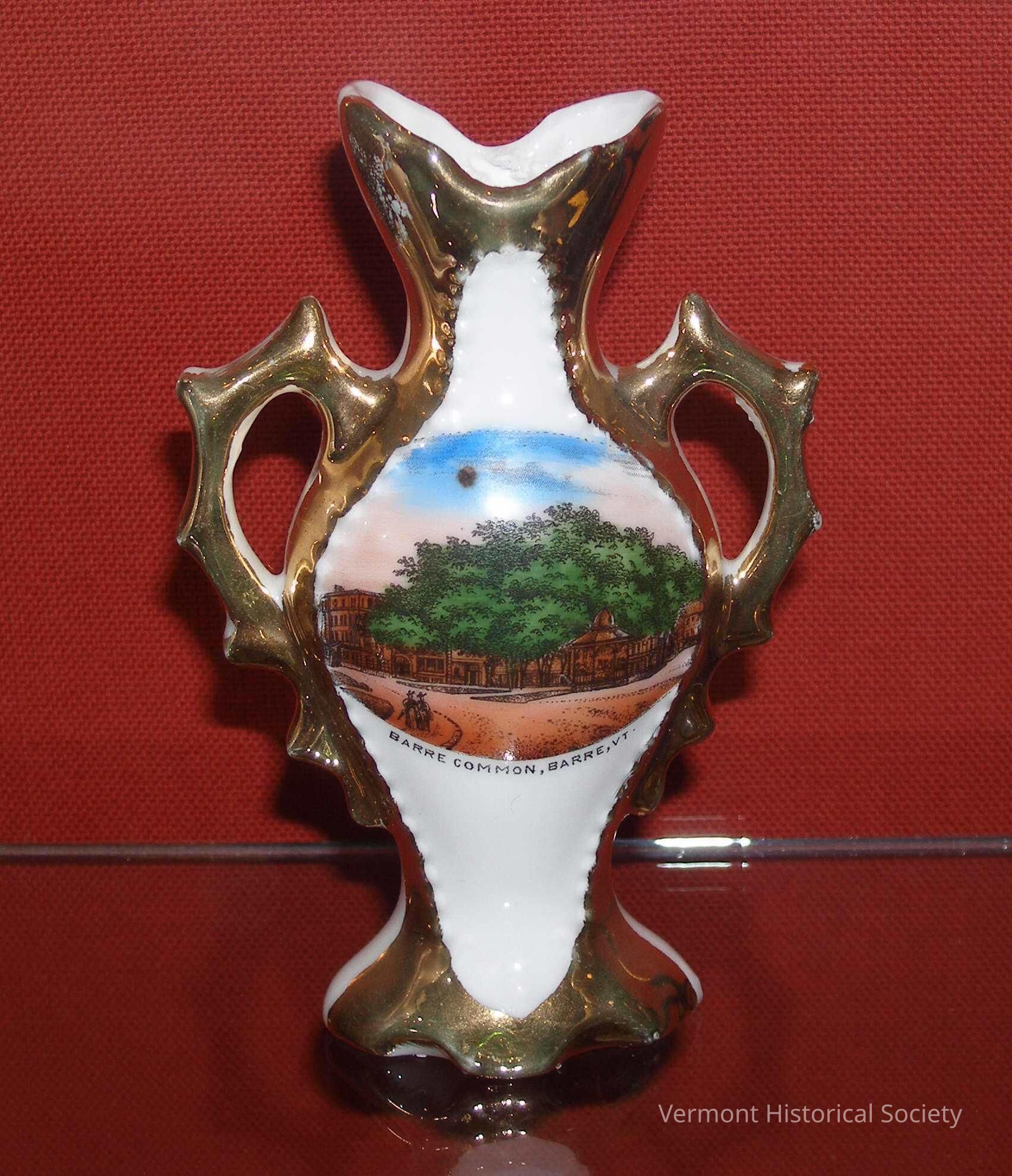 Miniature vase with two handles. The vase has an illustration of a city street scene with a large central tree and a bandstand. It is partially colored and has the label, "BARRE COMMON, BARRE, VT." The rest of the vase is lustered gold. The bottom bears the mark, "MADE IN GERMANY FOR C. N. Kenyon & Co., Vt."