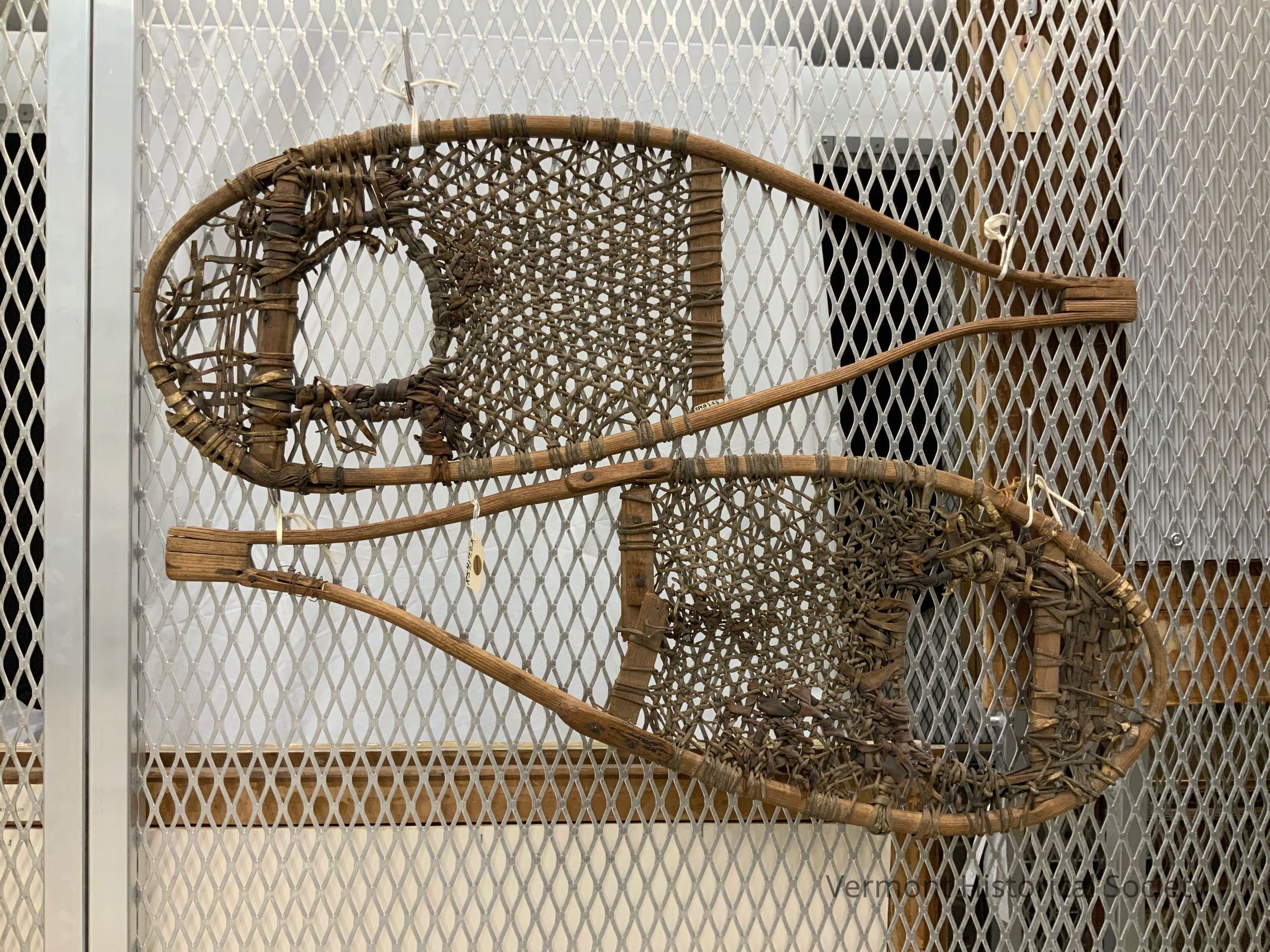 Wood and rawhide snowshoes. The snowshoes have a bent wood frame in a teardrop shape with two crossbars across the wide portion. The center of the wide portion, between the crossbars, is woven with strips of rawhide. There is a purposeful woven hole at the center front.
