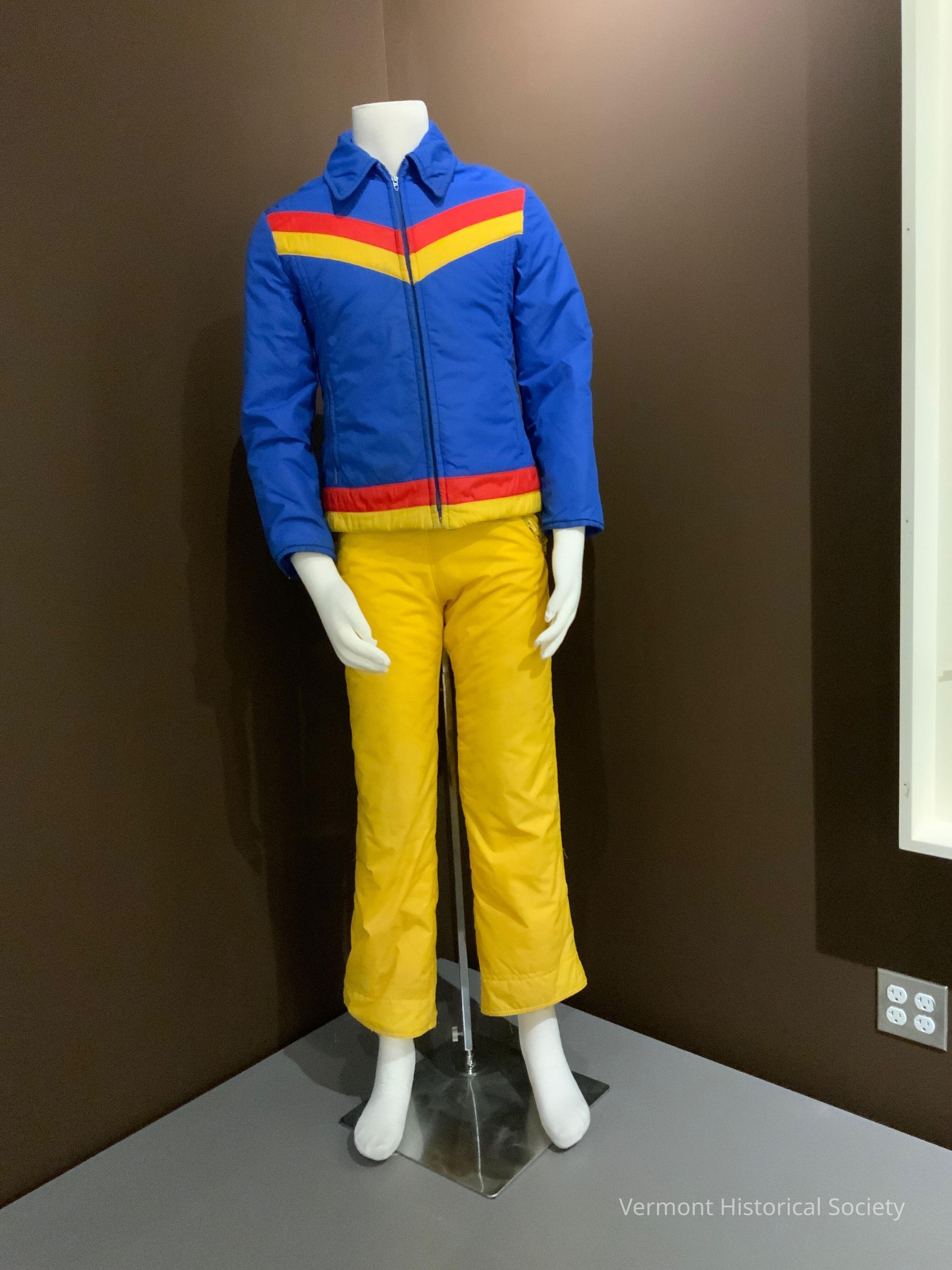 Ski suit consisting of jacket and overalls. The jacket secures with a metal zipper up the center front and has a pointed falling collar. The body and sleeves are blue. The hem is accented by a stripe of red and a stripe of yellow, which are repeated in a chevron across the chest. The overalls secure over each shoulder, snapping in place at the front, and there is a plastic zipper along the proper left seam to the hip. The pants flare outward at the hem, with an elasticized inner layer that fits close to the wearer’s leg. There are zippered pockets at the side front seams of the jacket and the side seams of the pants, and the wrists of the sleeves are adjustable with short metal zippers.Context