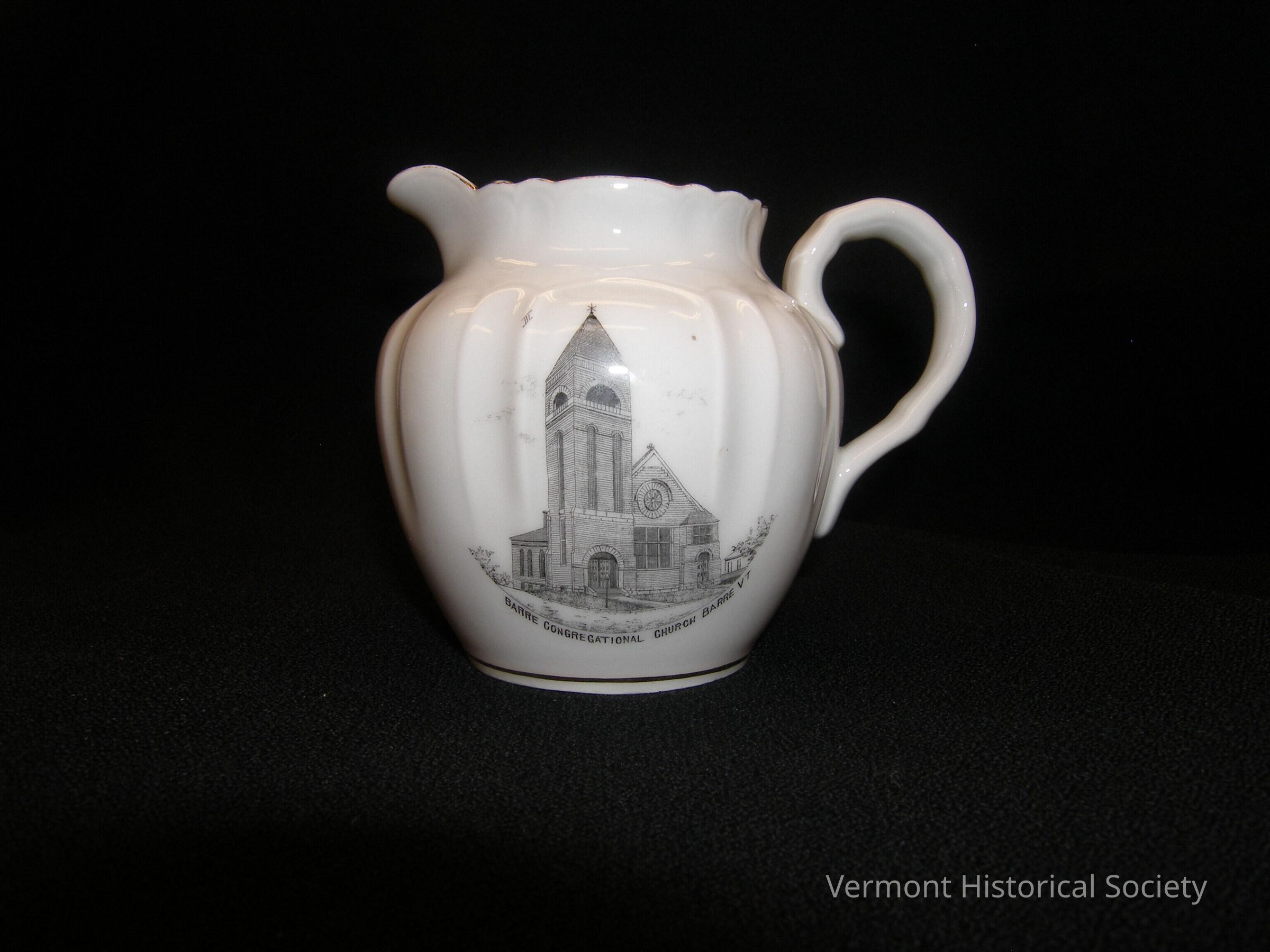 White ceramic cream pitcher with slightly fluted body and a scrolled and gilded rim. One side of the pitcher is printed with an engraved illustration of a building with a large, square bell tower at the front left corner. The image is labeled, BARRE CONGREGATION CHURCH, BARRE, VT." The bottom of the pitcher is marked, "MADE IN GERMANY GILLY & ABBOTT BARRE VT"