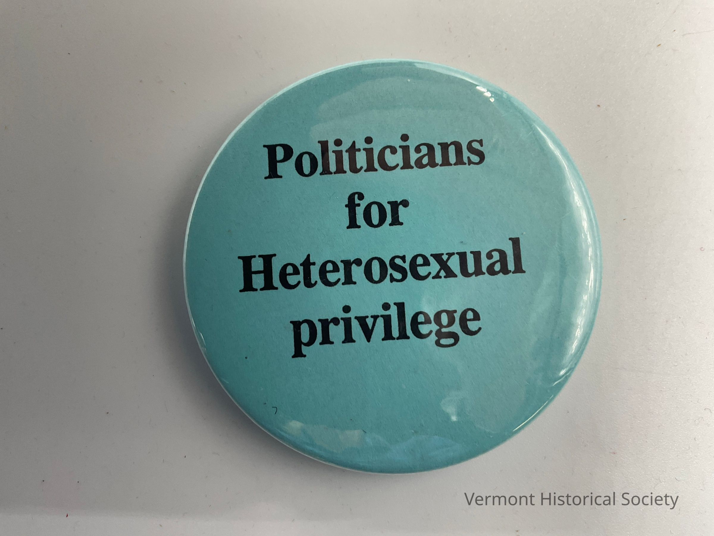 Round, blue button with a magnet glued to the back that reads, "Politicians for Heterosexual privilege".