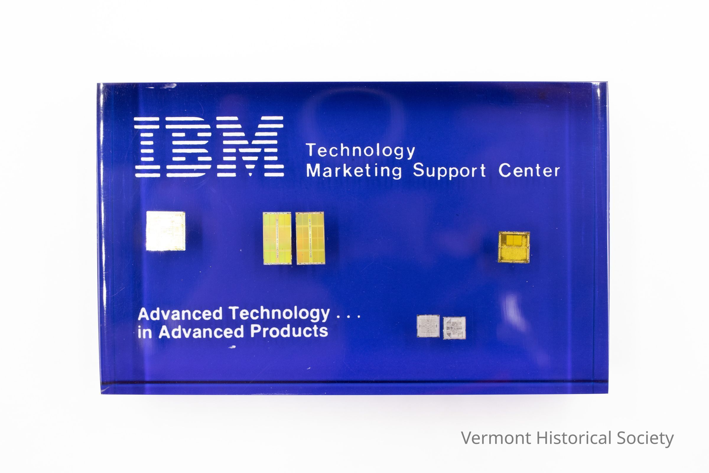 Rectangular resin paperweight containing gold-toned computer chips on a blue ground. The base is printed in white with the words, "IMB Technology Marketing Support Center / Advance Technology . . . in Advanced Products," viewable through the clear resin.