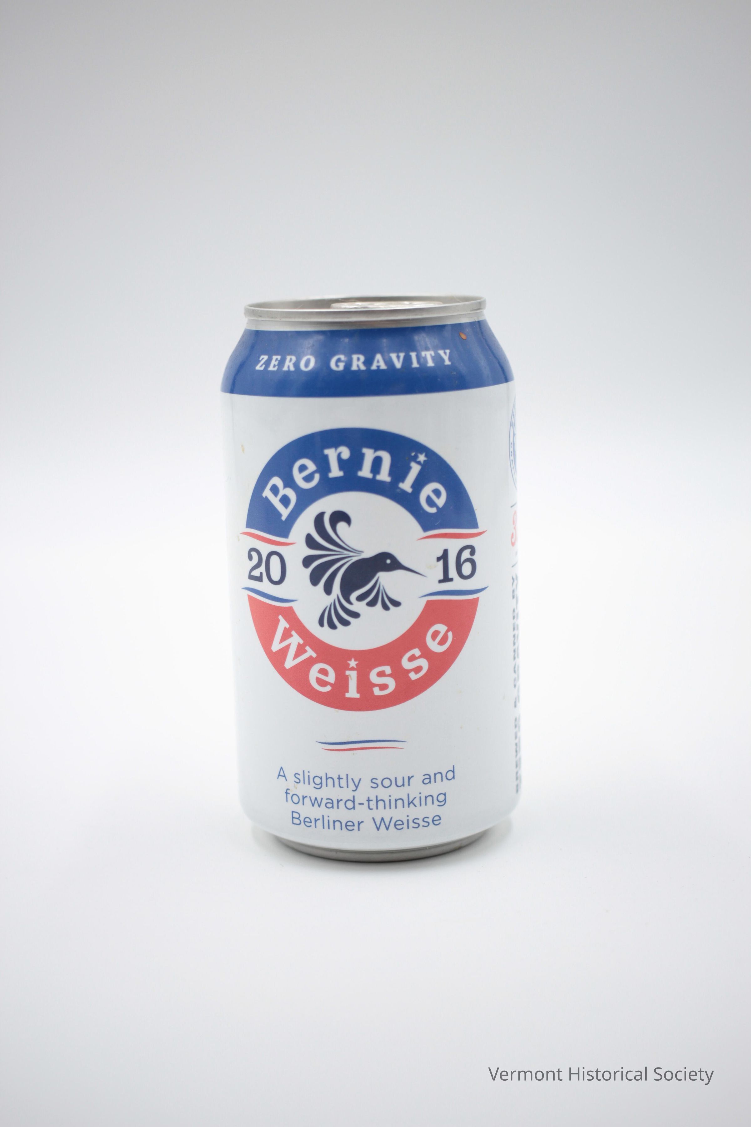 Promotional beer can with a round logo on one side and an illustration of a man (Bernie Sanders) on the other. The logo is blue on the top and red on the bottom with the words, "Bernie / Weisse", and the date 2016. There is a black bird in the center and the inscription, "A slight sour and forward-thinking Berliner Weisse", at the bottom. The words "ZERO GRAVITY" are in a blue band at the top. The reverse is printed with an illustration of a man leaning against a barrel and holding up a beer glass. He has spiky, white hair, and is wearing a plaid shirt and suspenders. The bottom of the can is printed with the words, "FREEDOM AND UNITY" in place of the expiration date.Context