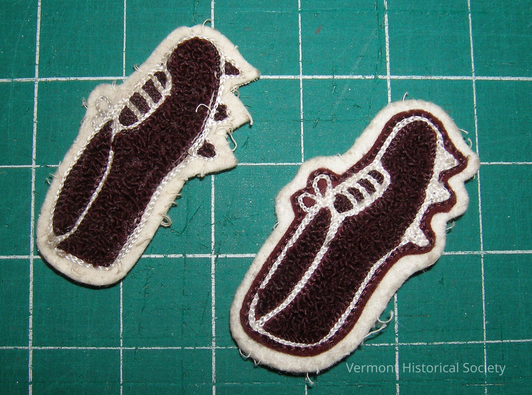 Pair of varsity patches in the shape of football cleats. Each patch consists of burgundy looped pile fabric appliqued to white felt. The outlines of the shoes are machine embroidered with chain stitch in white thread. Each patch is lined with plain-woven cotton fabric.