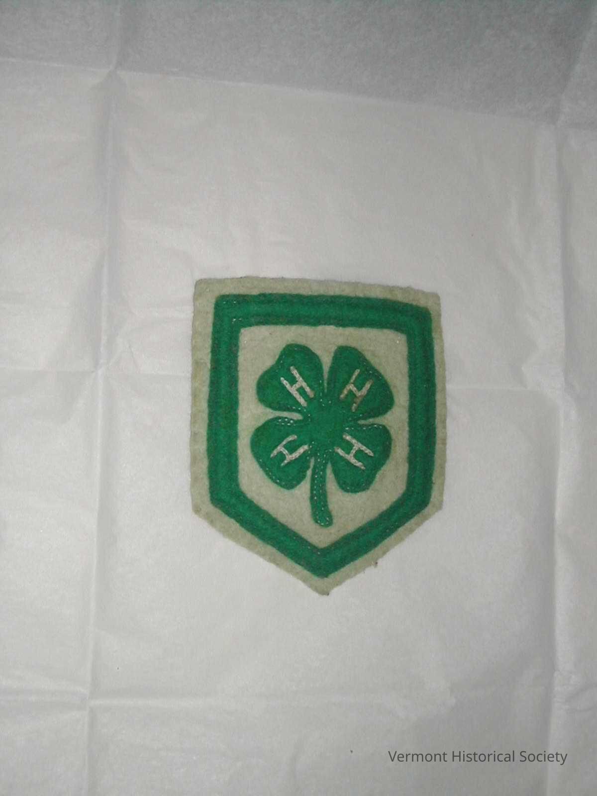 Shield-shaped patch of white felt appliqued with green felt in a four-leaved clover design. The clover has the letter H in every petal (the logo for 4-H club).