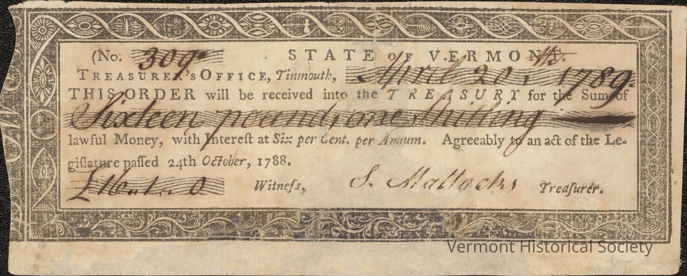 Rectangular paper money issued by the State of Vermont. The bill consists of a white rectangle of paper with cut edges on the top and bottom and torn edges of the two sides; the right is torn straight, but the left is torn quite roughly in a wavy pattern. It is printed with a decorative floral border and the printed inscription, "No. [309] STATE OF VERMONT, TREASURER'S OFFICE, Sunderland, [April 20, 1789] THIS ORDER will be received into the TREASURY for the Sum of [Sixteen pound, one Shilling ---] lawful Money, with Intereft at Six per Cent. per Annum. Agreeably to an act of the Legiflature paffed 24th October, 1788. [£16..1.0] Witnefs, [S. Mattocks] Treafurer." with the bracketed text handwritten in ink.Acquisition