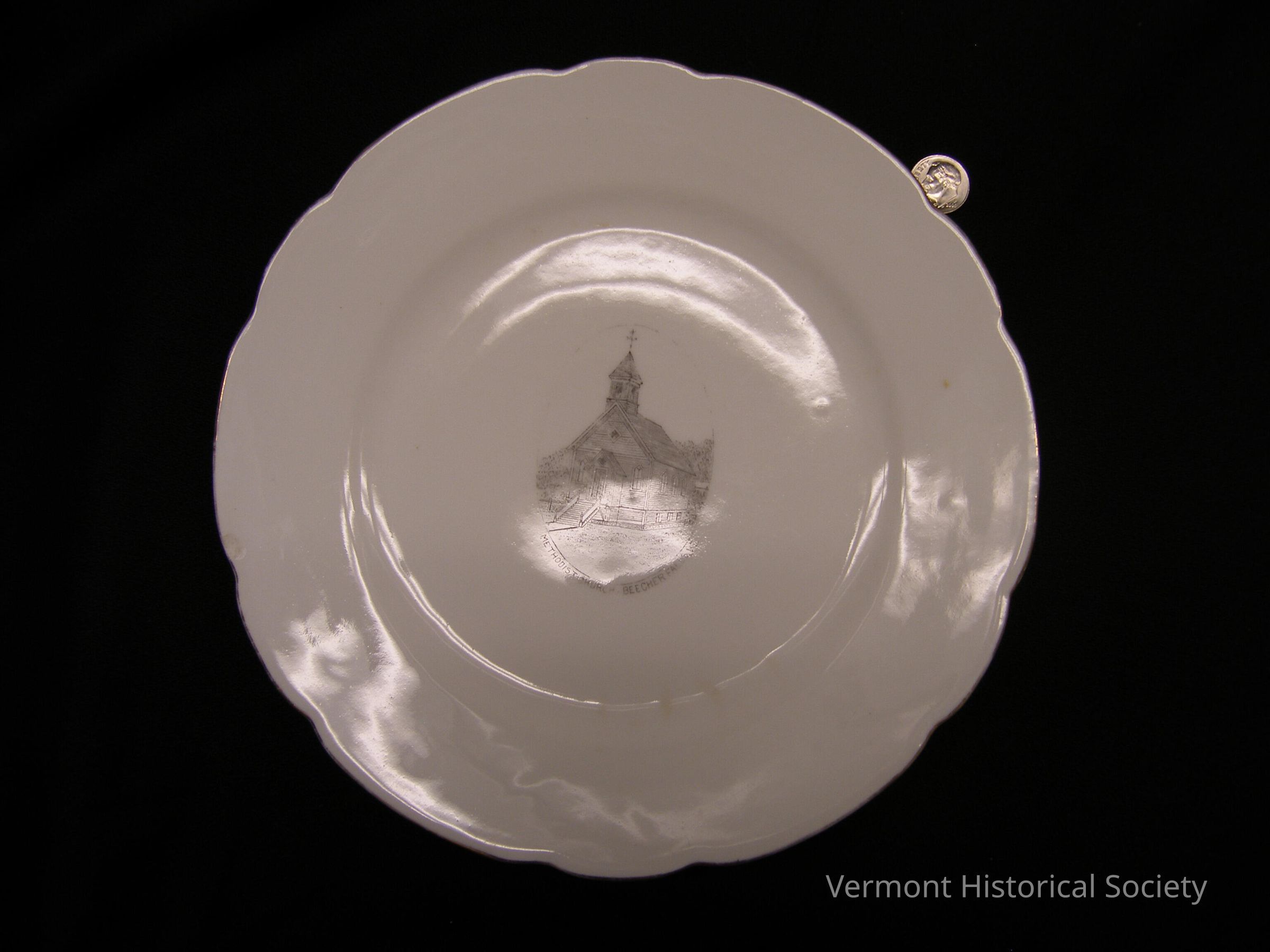 White porcelain saucer printed at the center with an engraved illustration of a clapboard building with a square, pointed cupola or short steeple at the center front of the roof's peak. The image is labeled, "Methodist Church, Beecher Falls, Vt." The reverse is marked, "Made in Austria for Mrs. M. J. Heath, Beecher Falls, Vt."Context
