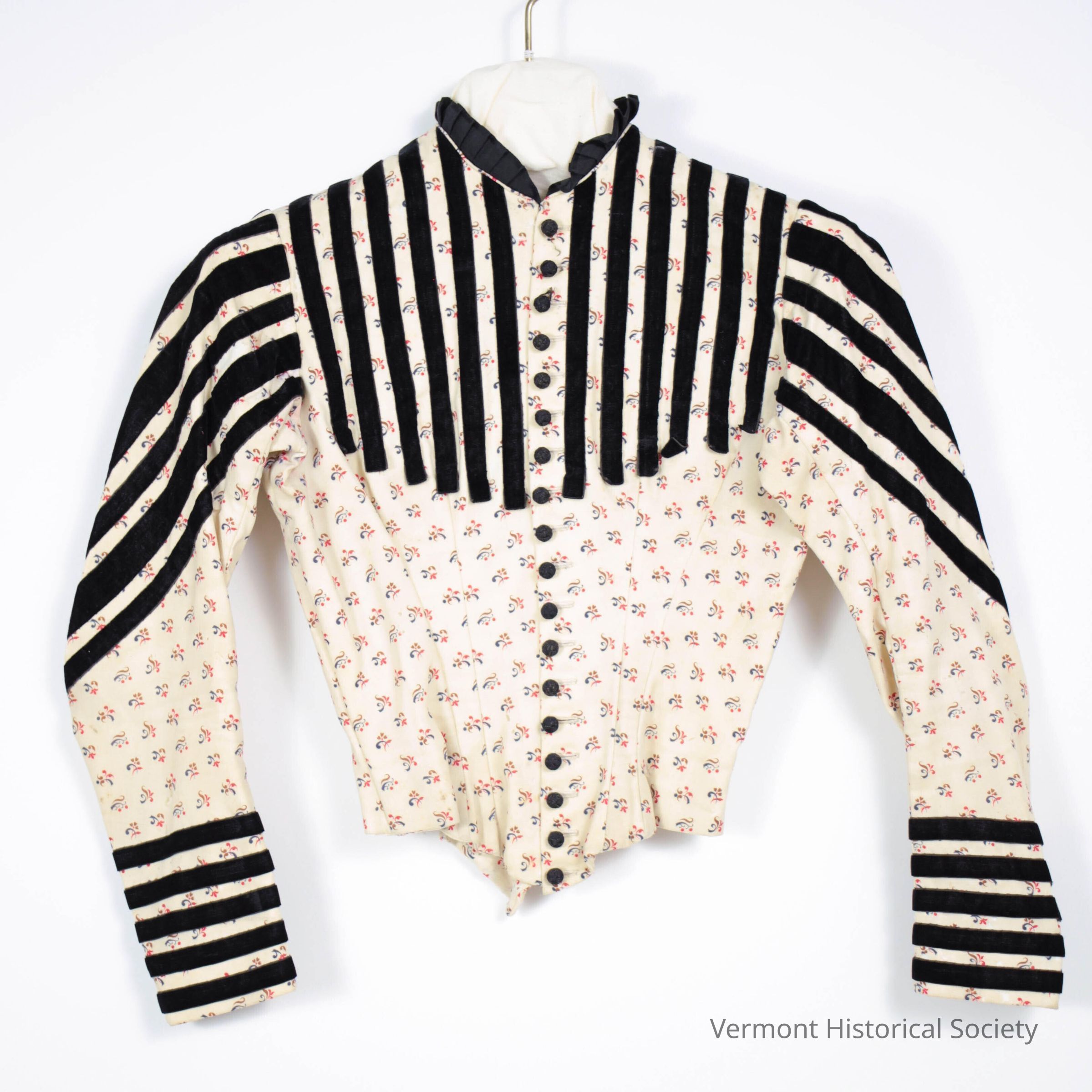Cream-colored wool bodice printed with pink and brown abstract floral sprigs. The bodice has long, curved sleeves, and opens at the center front with 18 black buttons. It is trimmed on the yolk, upper arms, and cuffs with strips of black velvet. The standing collar is made from pleated grosgrain ribbon.Context