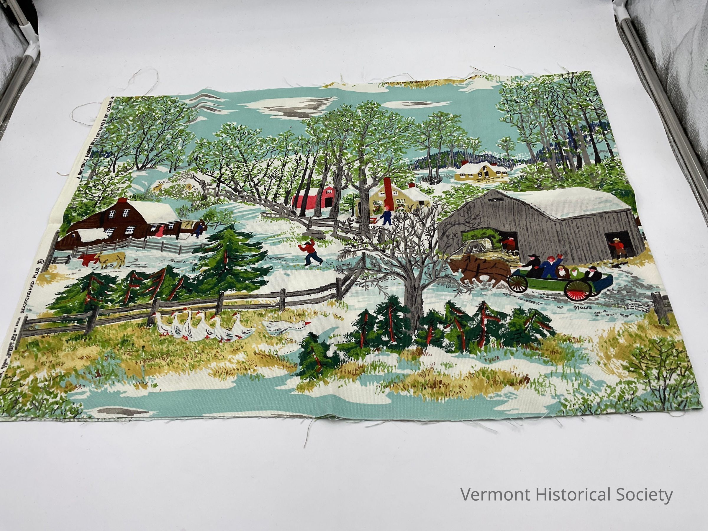 A fabric swath that replicates a painting by Grandma Moses entitled Early Springtime. Some online sources describe this as barkcloth that could have been framed, used for pillows or upholstery. the scene is a rural farm in the northeast with melting snow, geese, cows, horse-drawn wagon full of people.Context