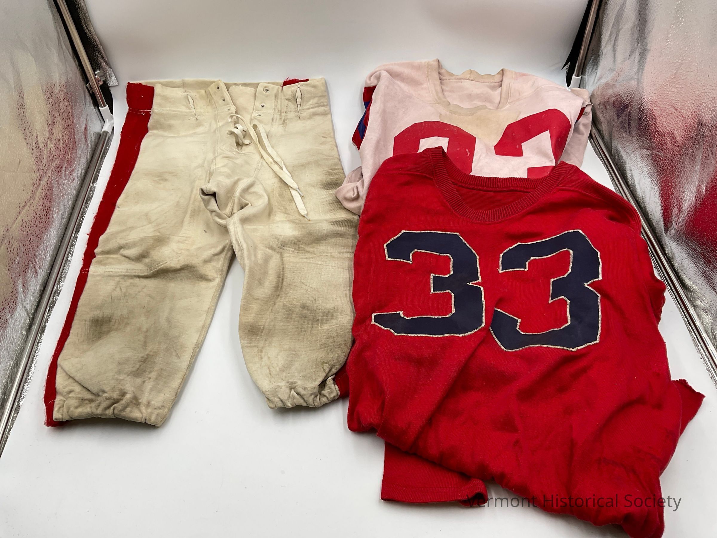b - Stained, pinkish-colored football jersey that may have once been white with red and blue strips around the armholes and a red number, 33, on back and front.