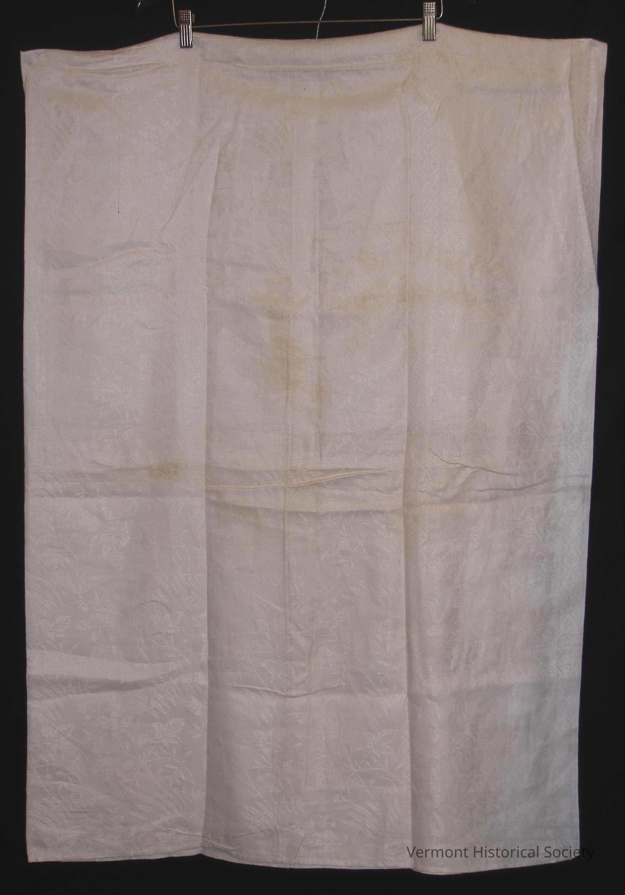 Linen damask tablecloth woven in a leaf design. Two sides are selvedges, and the other two sides are machine hemmed. The initials "LDH" are stamped on both hems.