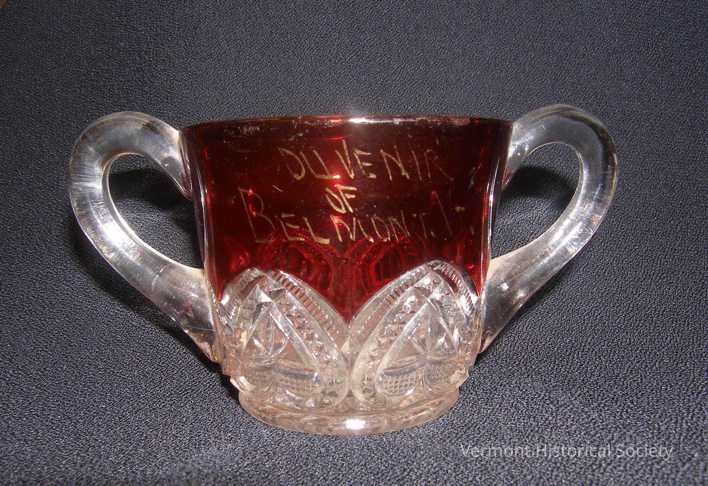 Miniature glass sugar bowl with two handles. The handles and the bottom half of the bowl are clear glass while the top half of the bowl is ruby glass. The clear portion of the bowl is molded into a faceted upside-down heart pattern. The cup is painted with the gold inscription, "Souvenir of Belmont, Vt."
