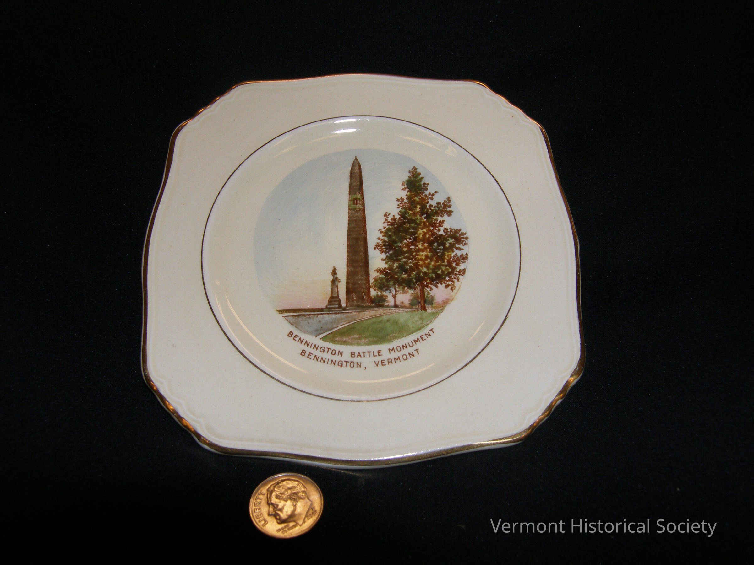 Bennington, Vt. Cream-colored square souvenir plate with gold rim and circular image in center of "Bennington Battle Monument, Bennington, Vermont" Mark on bottom: "Made in Staffordshire, England, Jonroth, England, Royal Winton" and "Imported for Atkins Jewelers, Bennington, Vermont".Context