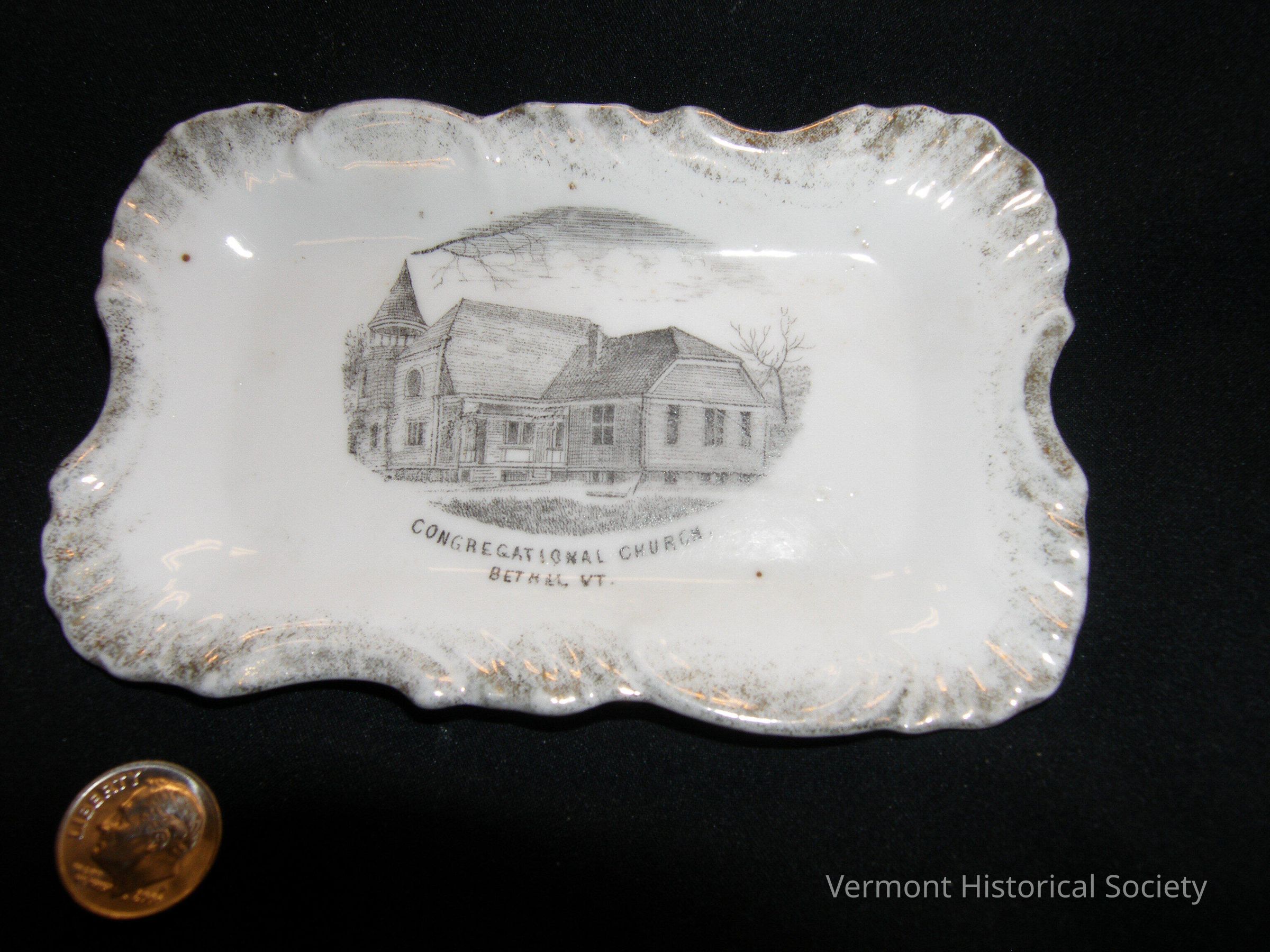 Rectangular card receiving tray with rococo feathered edges. The edges are printed with gilding. The center is printed with an engraved illustration of a large, winged building with a tower at the far corner. The image is labeled, "CONGREGATIONAL CHURCH BETHEL, VT." The reverse is marked, "Made in Germany for C. W. Marston, Bethel, Vt."Context
