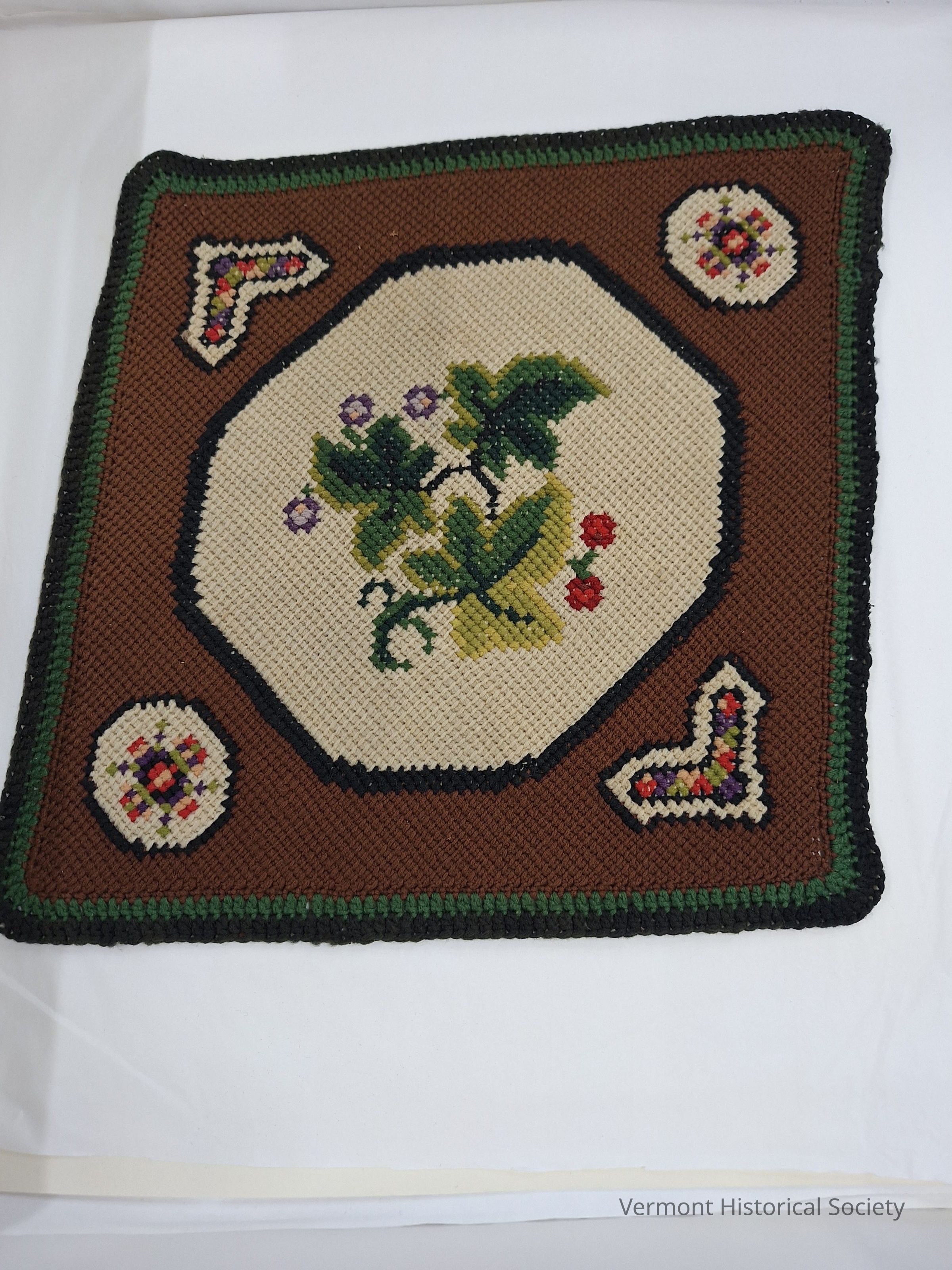 Doll's coverlet; wool yarn; crocheted; afghan stitch with cross stitching.