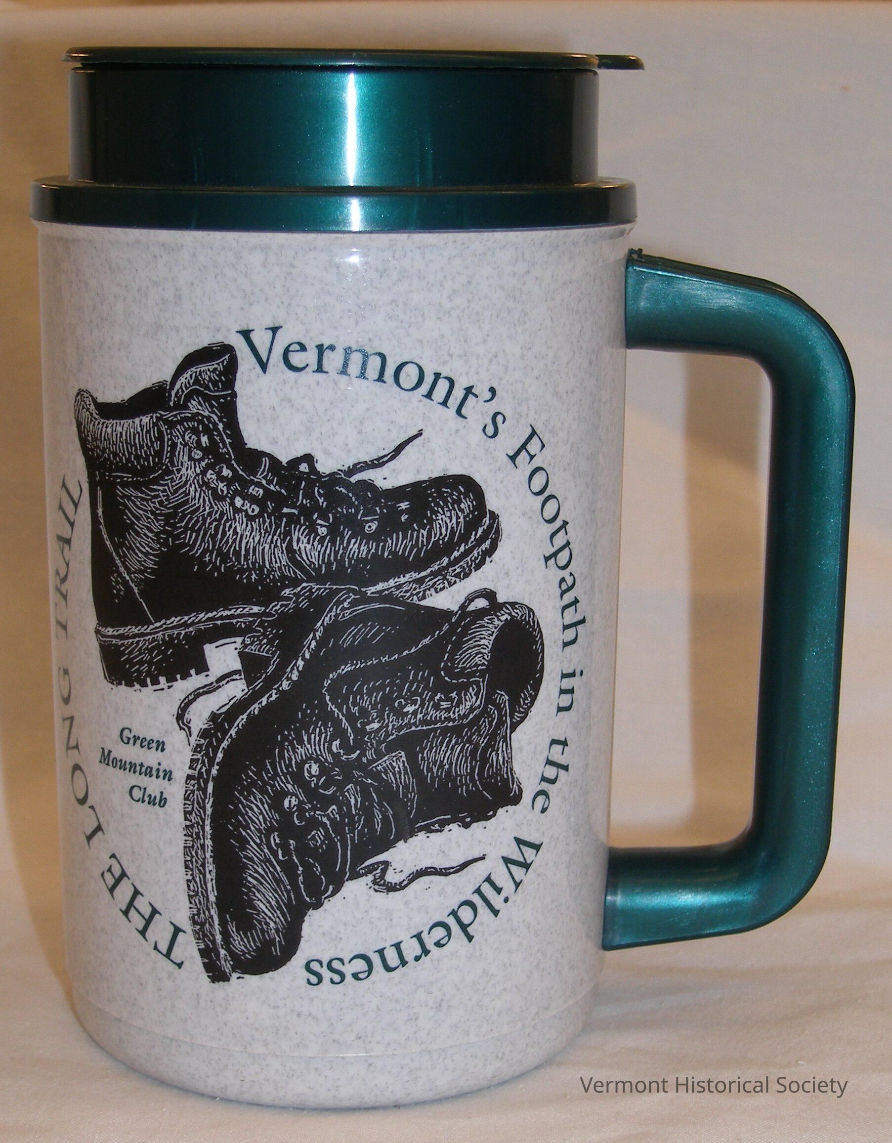 A cylindrical, insulated travel mug with a cover that snaps on. Gray mug with dark green top, lid/cover and handle. Two sides of the mug have the following images: side 1) pair of hiking boots with writing surrounding "THE LONG TRAIL Vermont's Footpath in the Wilderness" with a much smaller "Green Mountain Club" side 2) "The Green Mountain Club/ Founder and Protector of the Long Trail Since 1910" / "Vermont's Long Trail---445 Miles of/ Backcountry Adventures!/ (a vertical map showing the trail thru VT.)/ The Green Mountain Club/ Route 100. Waterbury Center, Vt. 05677.(802)244-7037"