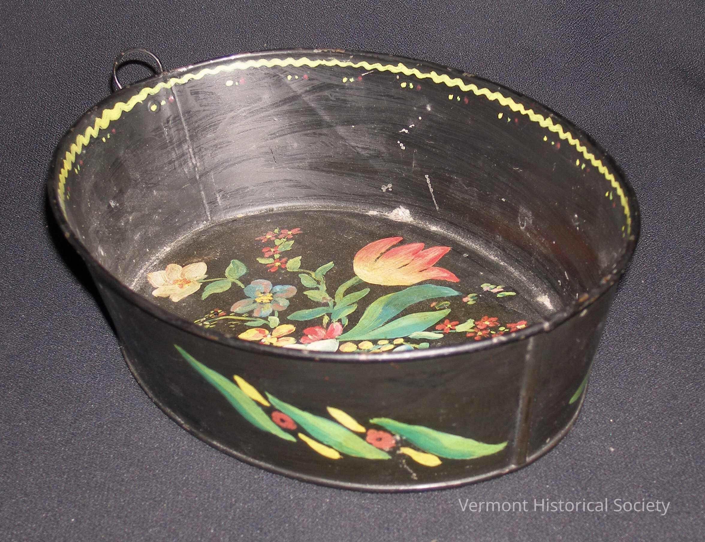 Painted tin bucket with an oval base and flaring sides. The metal is painted black all over, and there is a metal wire ring on one side for hanging. The bottom of the interior is painted with a bouquet of flowers, including a tulip, bellflowers, and other garden flowers. The interior edge is painted with a wavy line of yellow and yellow and red dots. The outside walls are painted with an abstract design of leaves and flowers.Context