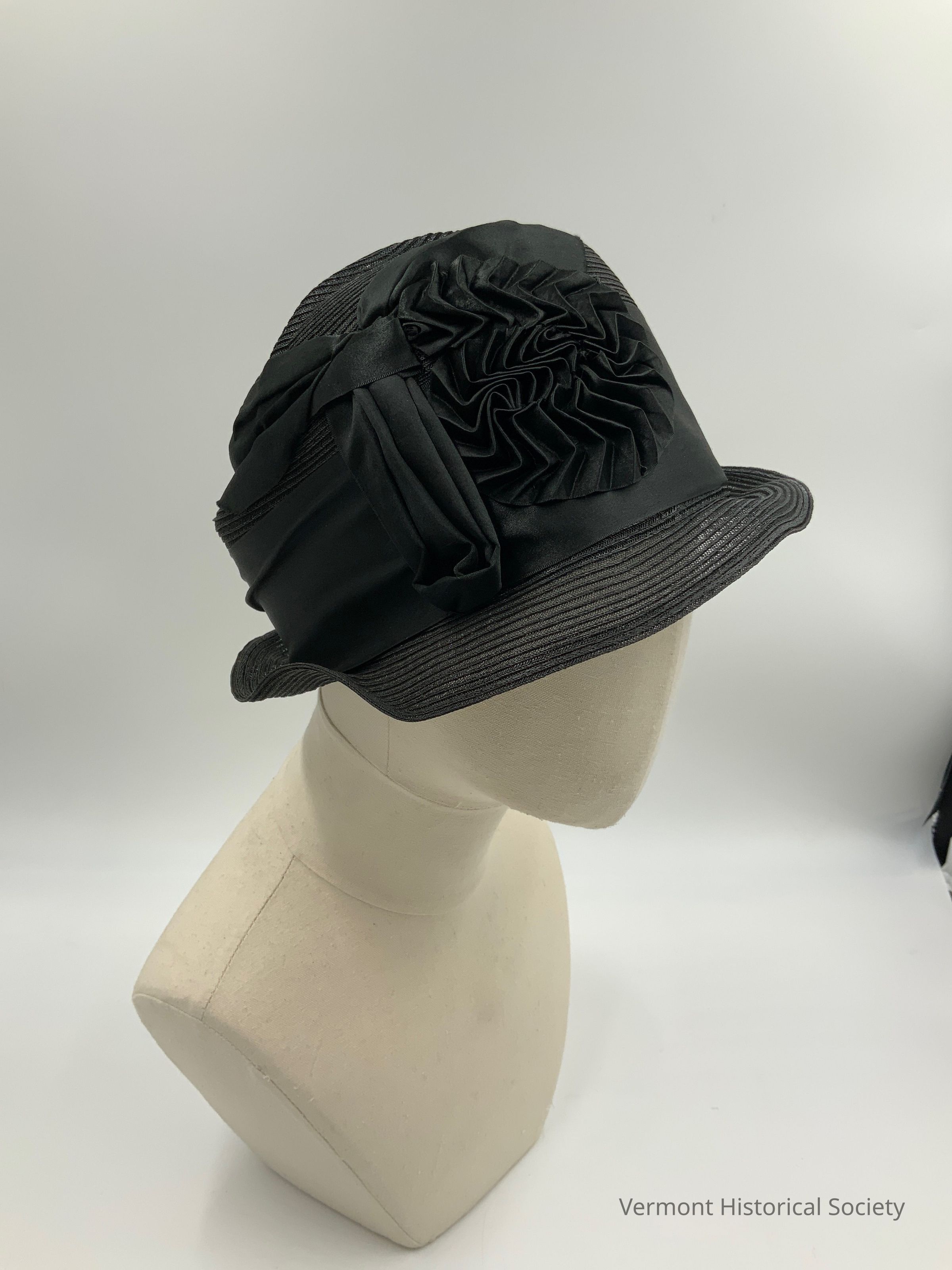 This is a black straw cloche hat. The crown of the hat is adorned with a wide silk ribbon that is decoratively pleated and looped at the front right.