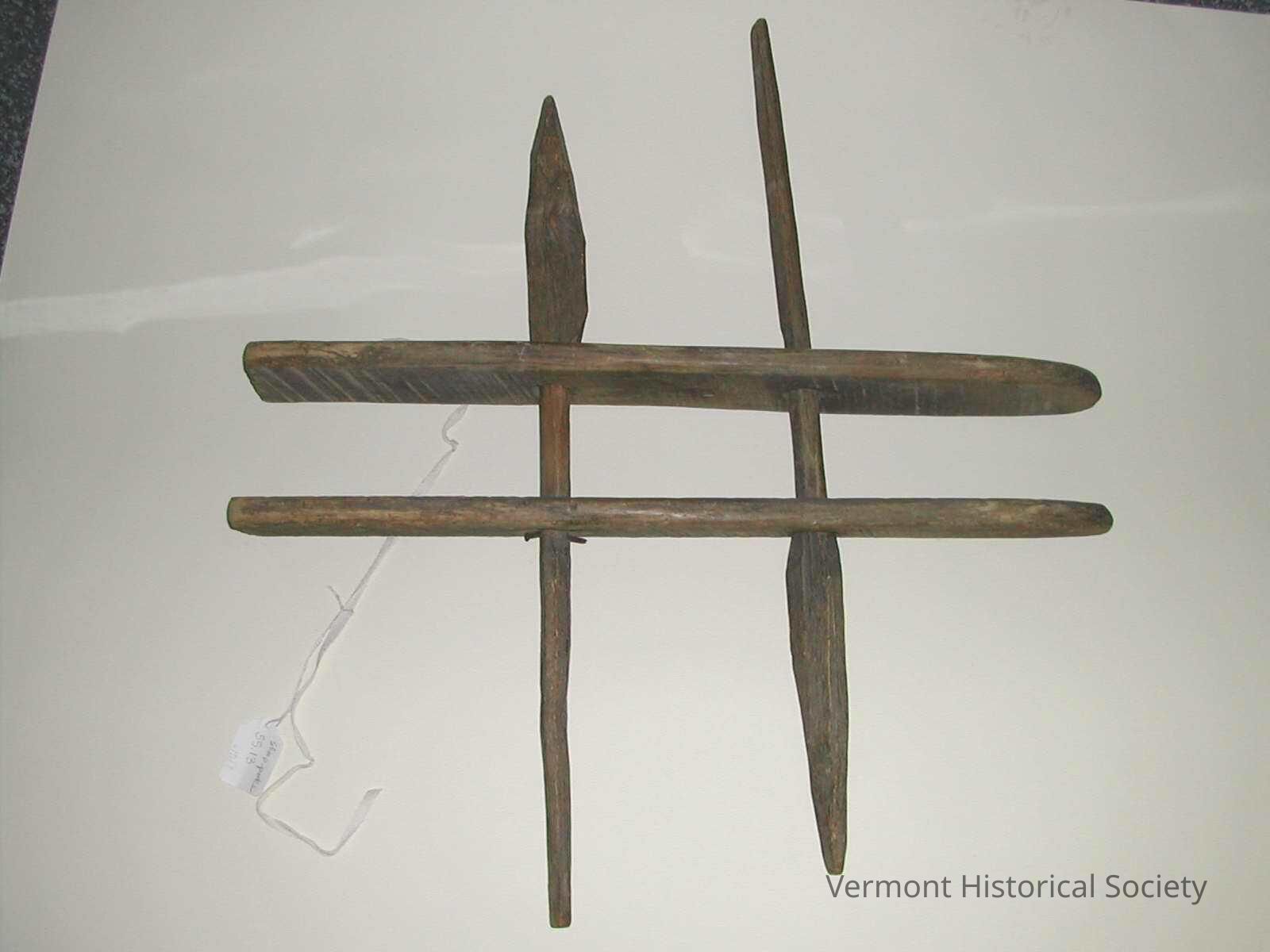 Wooden sheep poke, or sheep check. It consists of four wooden rods, two shaped like Us and two shaped like spears. The spear-shaped rods are inserted through the U-shaped rods, with the spear heads holding them in place.
