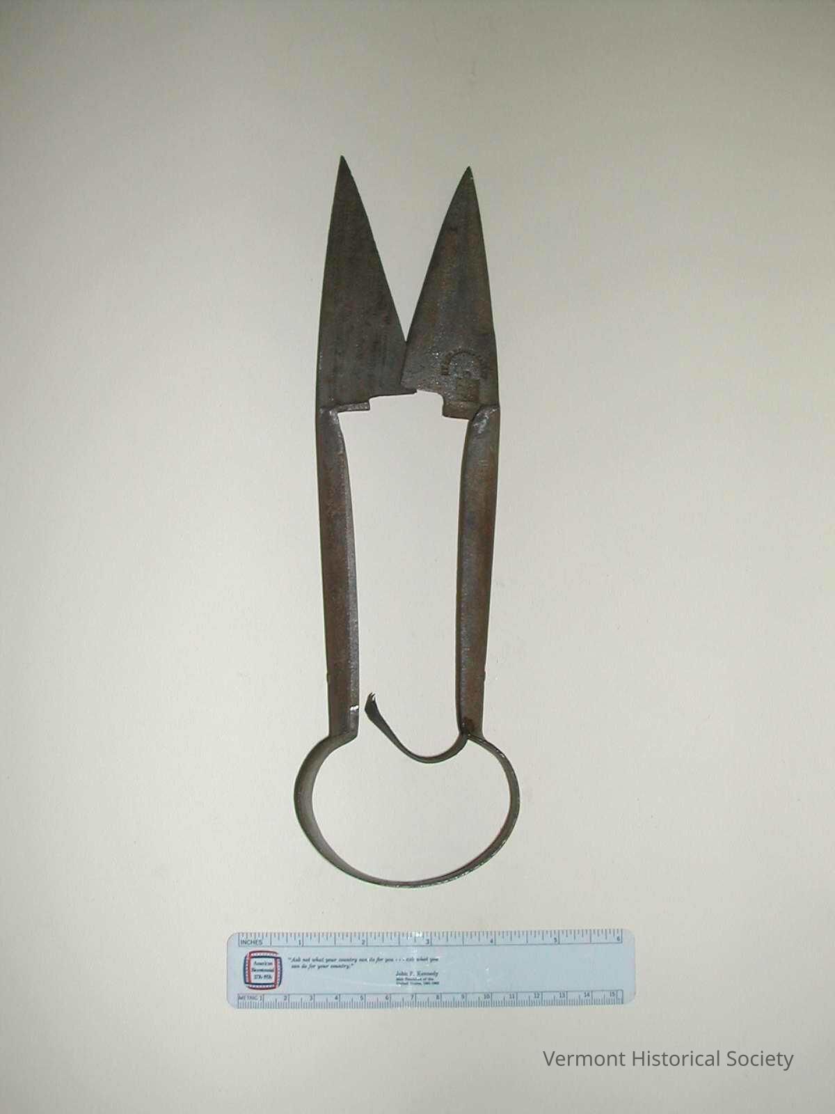 Metal sheep shears. The shears consist of two triangular blades attached at the center with a U-shaped piece of metal.