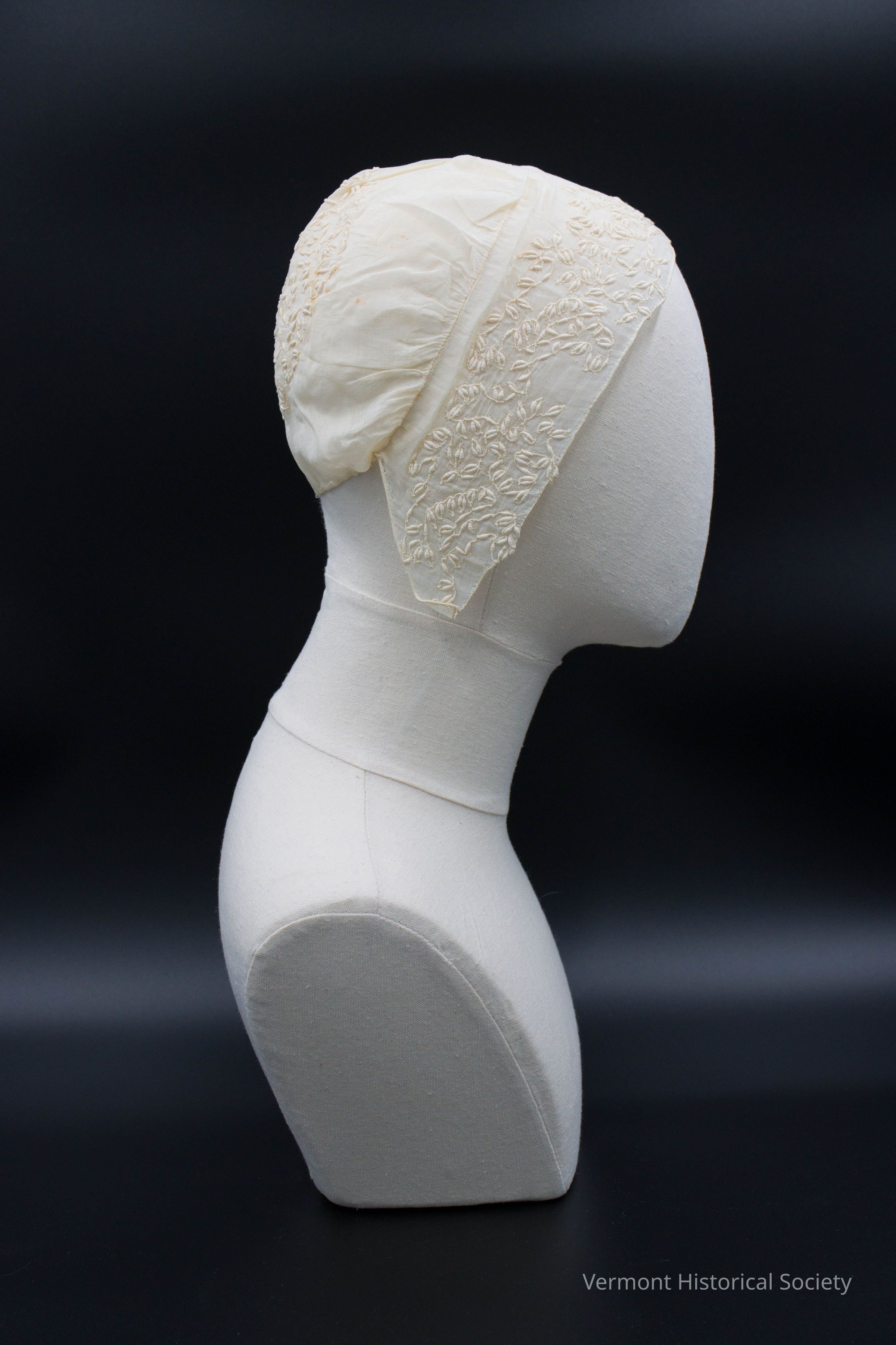 White cotton cap constructed in 2 parts: the caul and the brim. The caul is gathered into the brim and around a cord at the neckline, creating even fullness. Both piece are embroidered with white thread with a design of leafy vines.Context