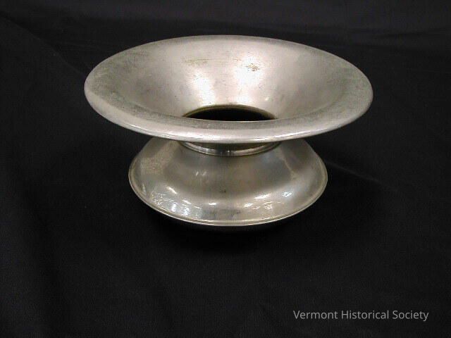 Silver-toned metal spitoon. It has a wide top rim narrowing to a smaller opening into receptacle.