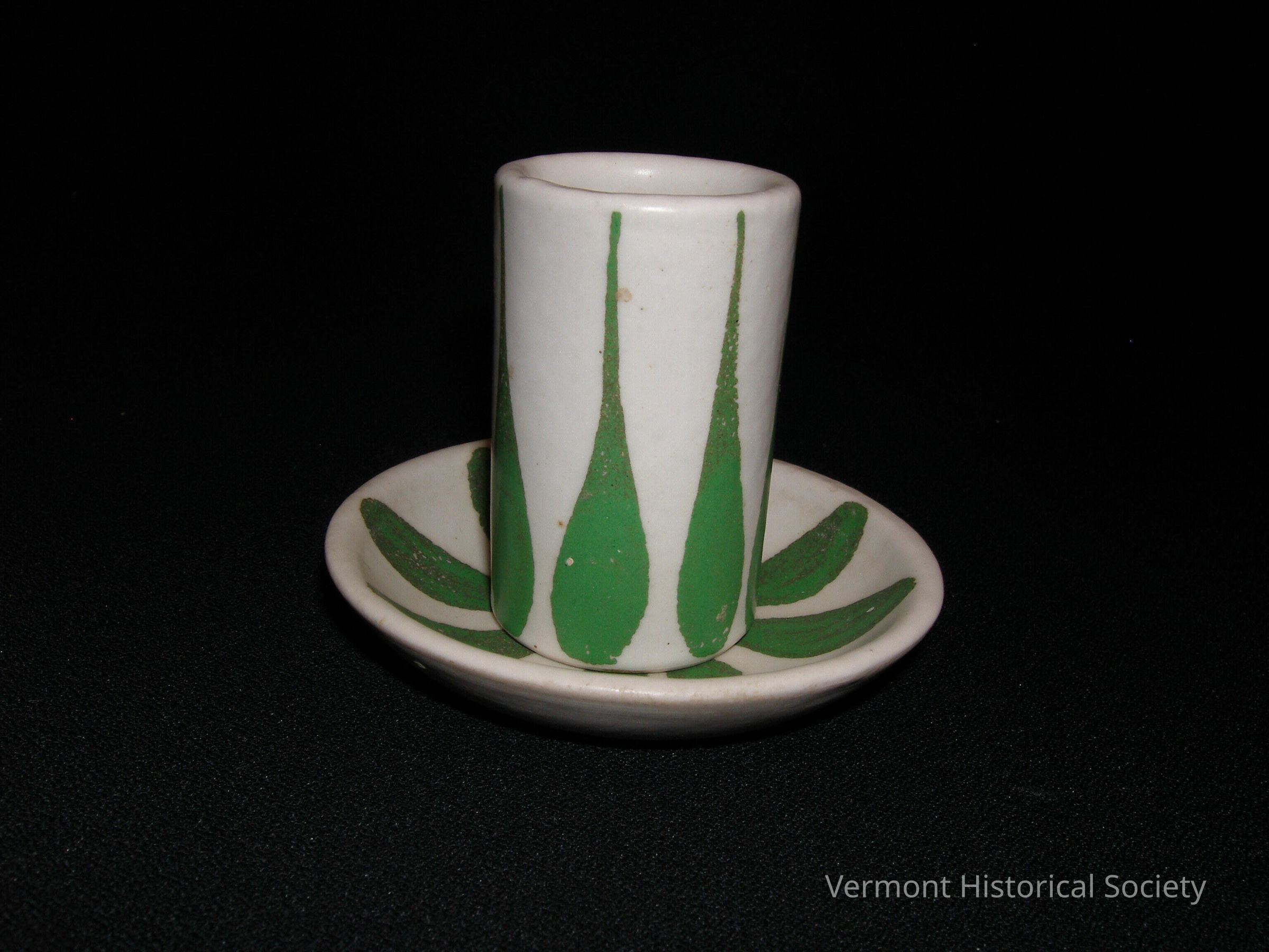 White ceramic vase and saucer decorative with elongated green leaves. Both are marked on the bottom, "mann".Context