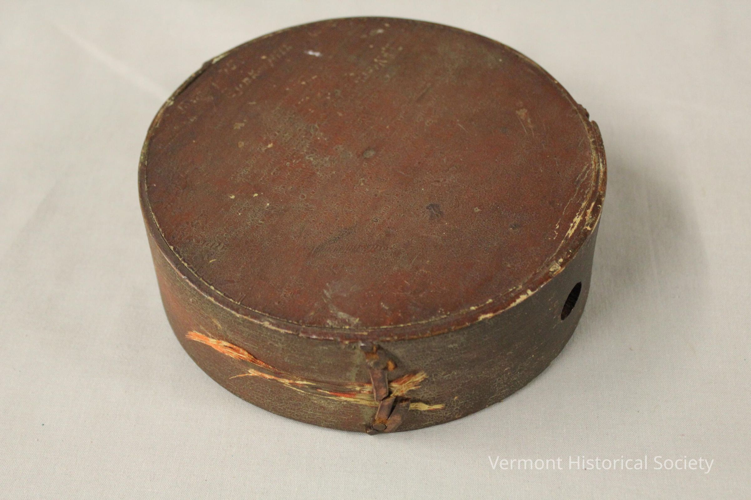 Red-painted wooden canteen with flat, circular sides and a bentwood edge. There is a hole, but no spout. It is accompanied by remnants of a blood-stained silk handkerchief. One side is scratched with the inscription, "Jan 7 75 Bunker Hill".Context