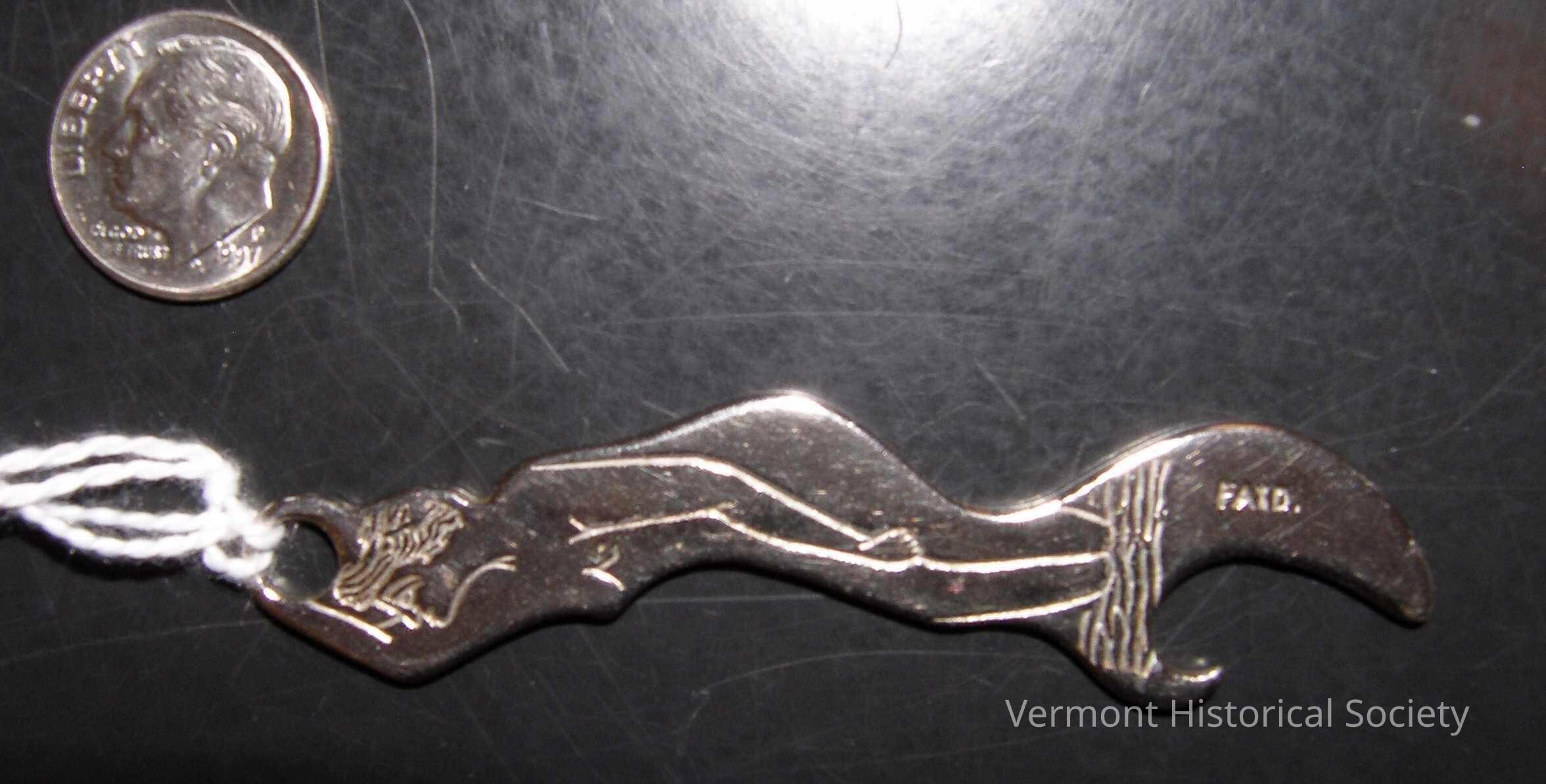 Bottle opener from Zan's Purity Sodas in Barre, other side shows a nude woman standing in water. The bottle opener portion is at the feet. Zan's Sodas Inc. are listed in the 1938 Barre Directory. "Zan's Sodas Inc., soda mfrs 4 Prospect pres-tres Charles Zanleoni Jr. see p 16" Also listed is "Zan's Beverage Corp./ beer and wine distributors 2 Prospect pres-tres Charles Zanleoni Jr. see p 16"